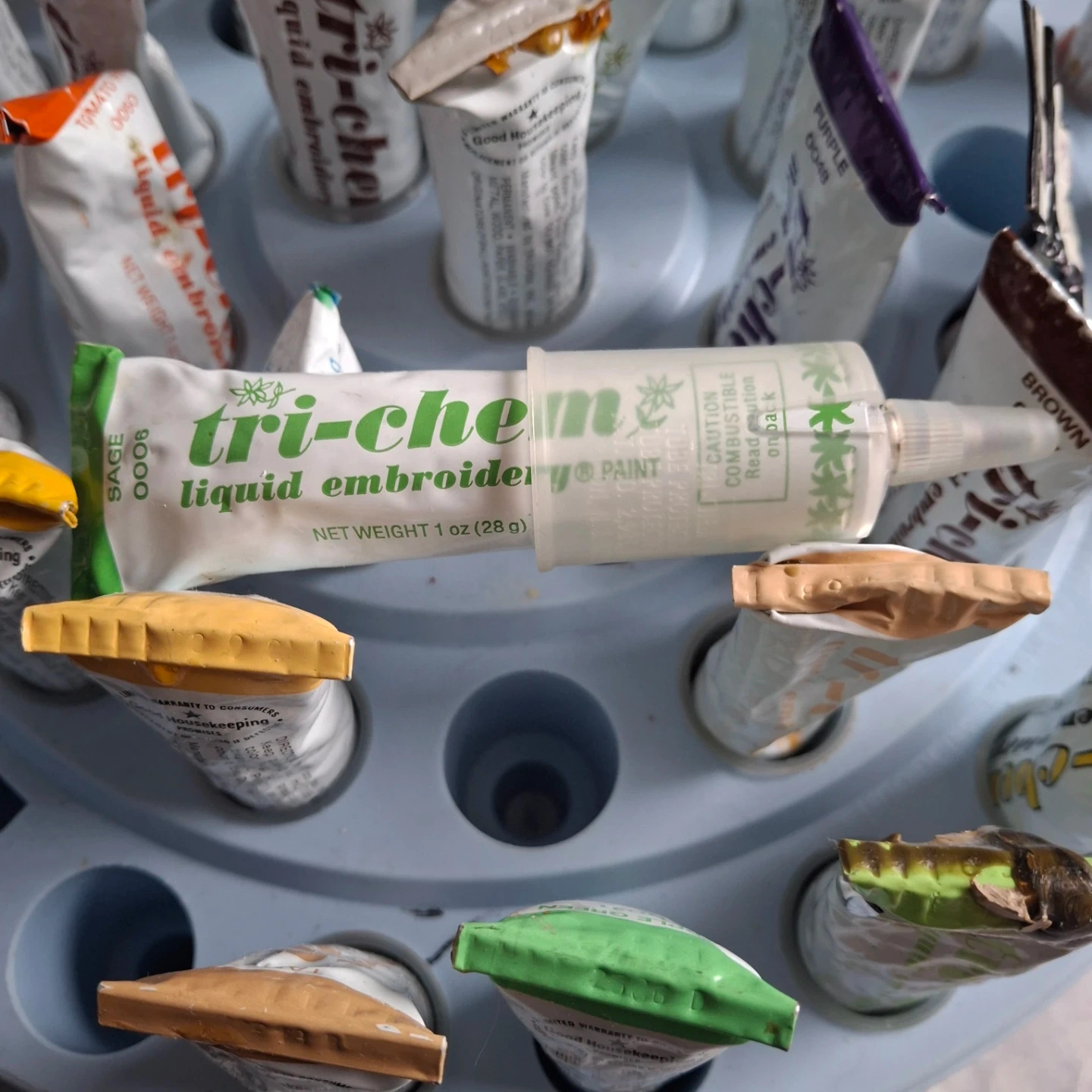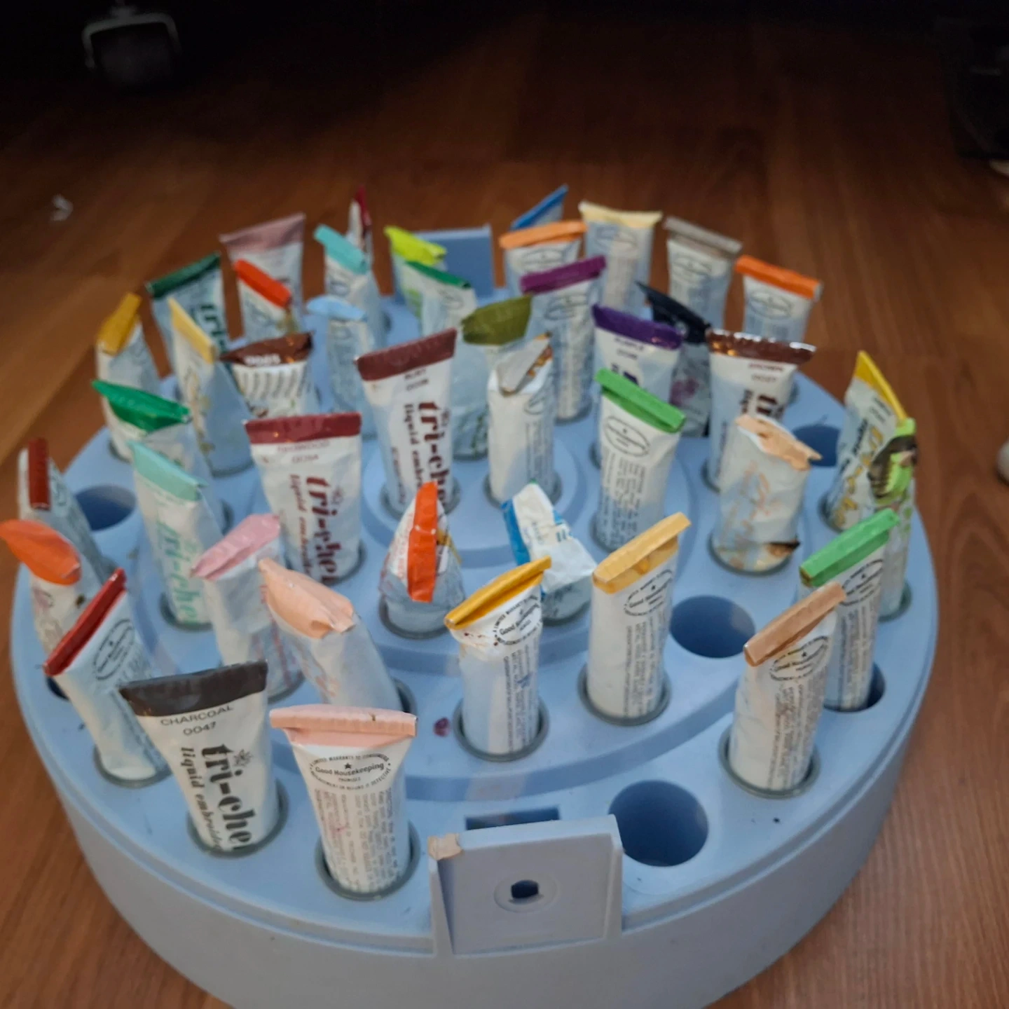 This set includes a variety of Tri-Chem liquid embroidery paints in different colours. The paints come in a convenient organizer caddy