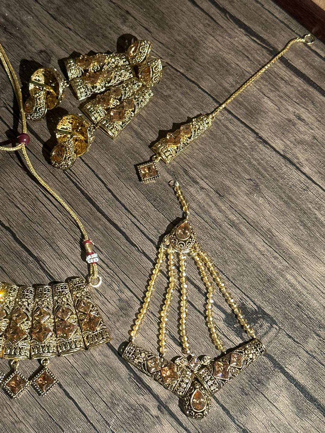 Selling a beautiful gold Indian jewelry set! The set includes a necklace, earrings, and a headpiece. The jewelry features intricate designs and would be perfect for a special occasion or cultural event. If you wanna break the set, message meπ
