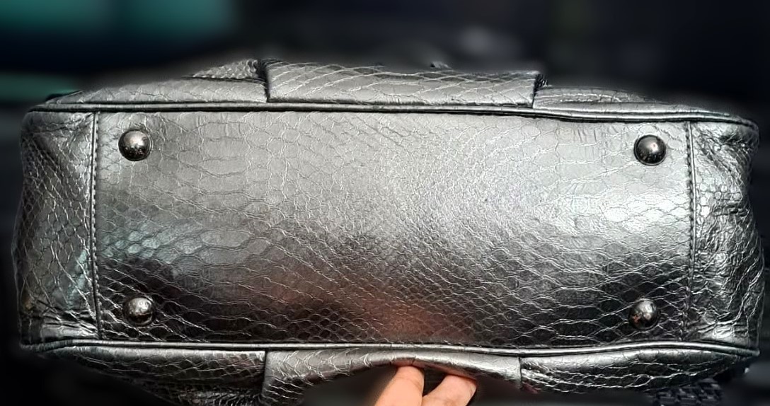 Material: High-quality python-embossed leather with a stunning metallic gunmetal/pewter sheen.