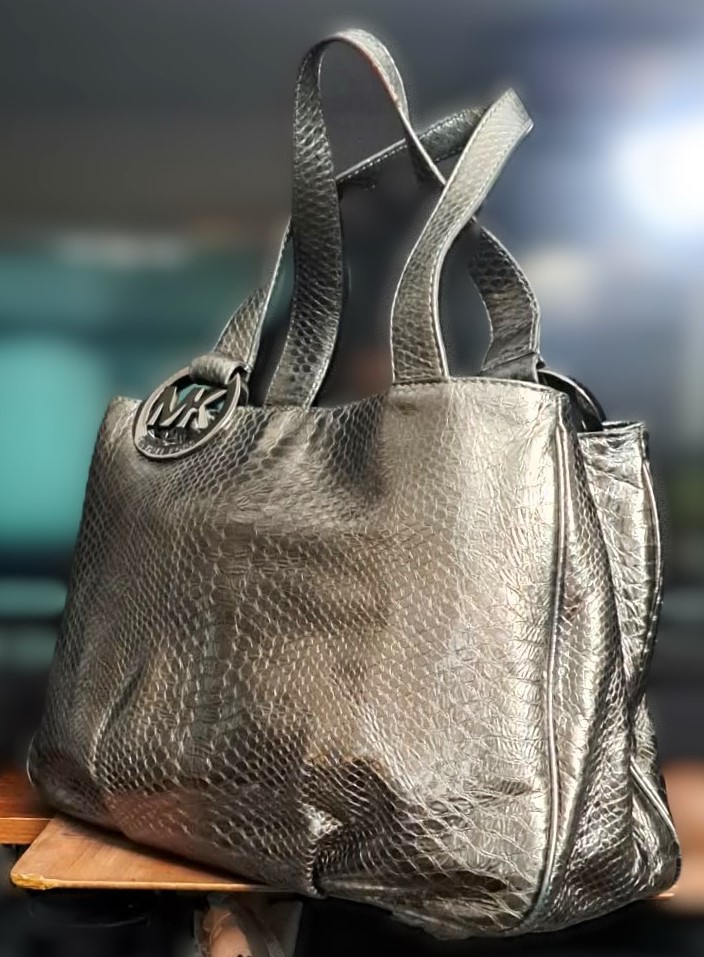 Add a touch of vintage glamour to your collection with this stunning Michael Kors Fulton East West Tote. Crafted from luxurious metallic python-embossed genuine leather in a sleek silver/gunmetal hue, this bag features the iconic oversized "MK" circular hardware that defines the Fulton line. Original price $498 USD