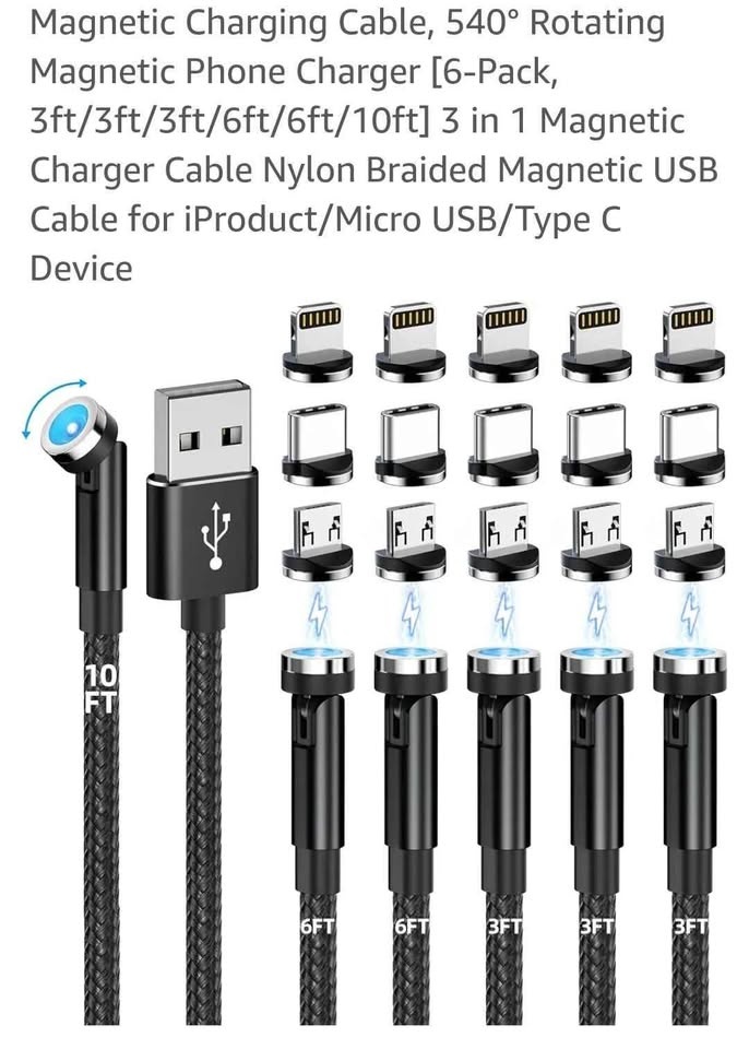 Each magnetic Phone charging cable compatible with Micro/USB-C/iProducts devices. One magnetic cable can charge three different types of devices.