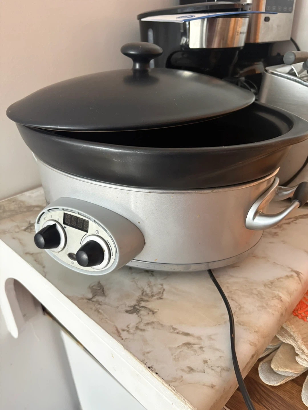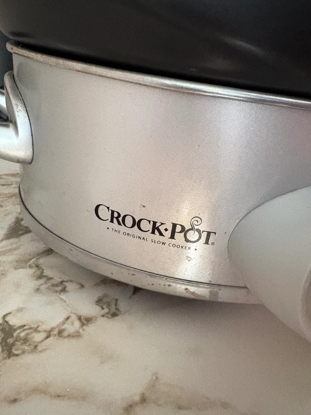 This Crock-Pot is the original slow cooker. It has two knob controls and a digital timer display. The pot is silver with a black lid. It's great for making large meals or batch cooking.