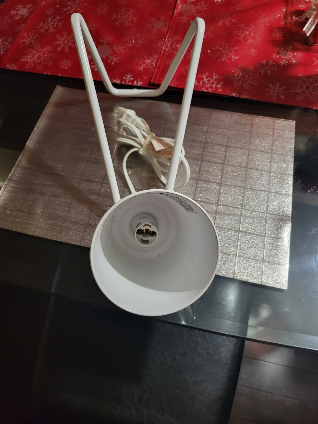 This is a white metal desk lamp. It has a flexible arm and a simple metal shade. The lamp requires one bulb, not included. Only use for staging 🥕