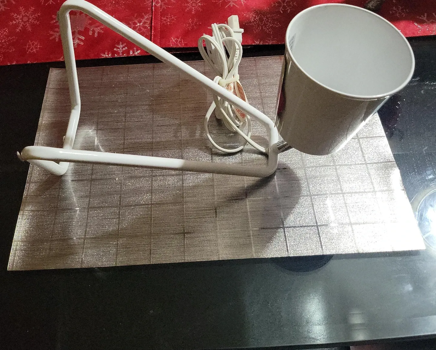 This is a white metal desk lamp. It has a flexible arm and a simple metal shade. The lamp requires one bulb, not included. Only use for staging 🥕