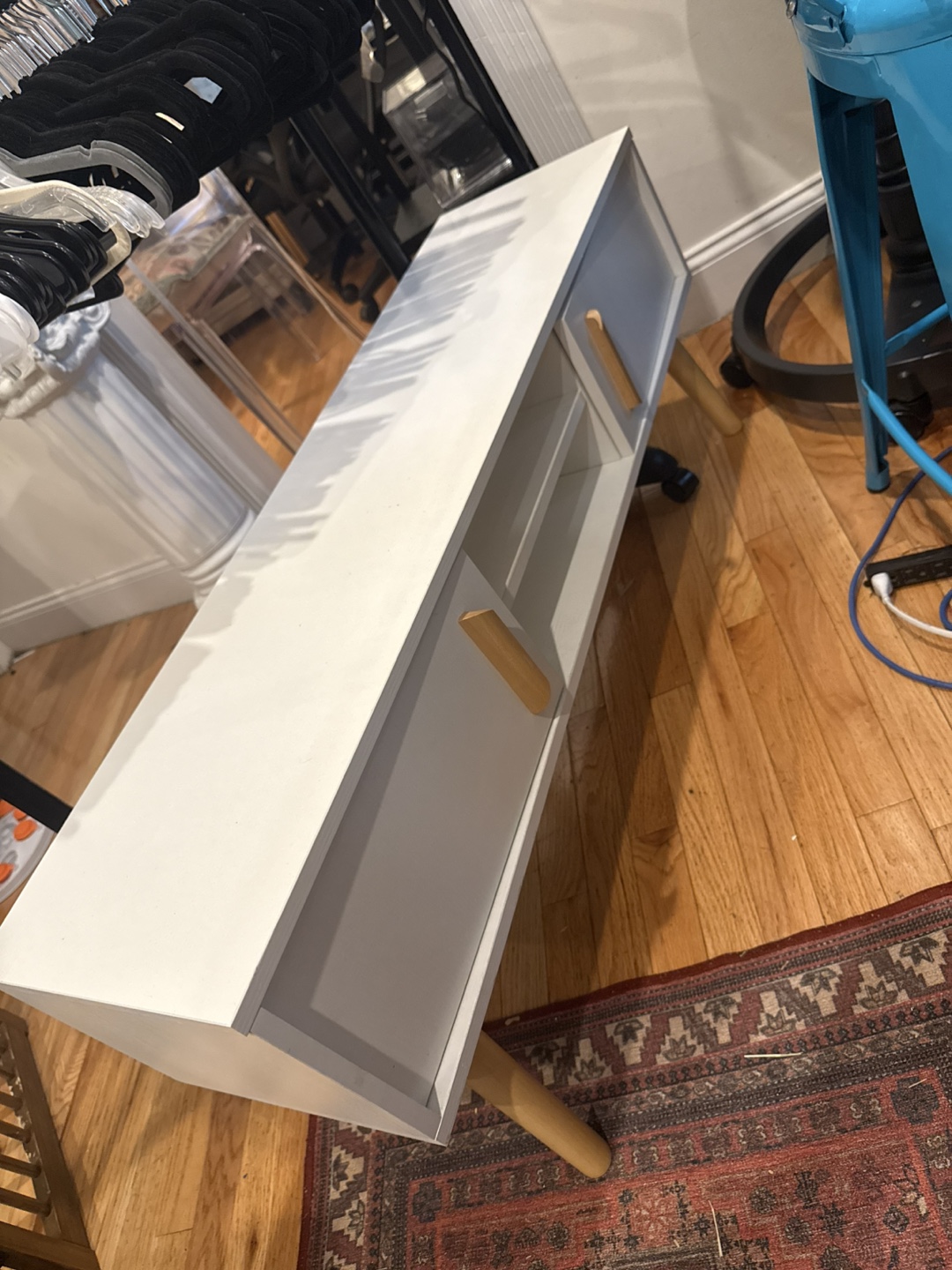 Selling a stylish white TV stand or media console! It features clean lines and a minimalist design, perfect for any modern living space. The console has storage space with doors and a shelf for your media devices. It’s in great condition and ready to find a new home!
