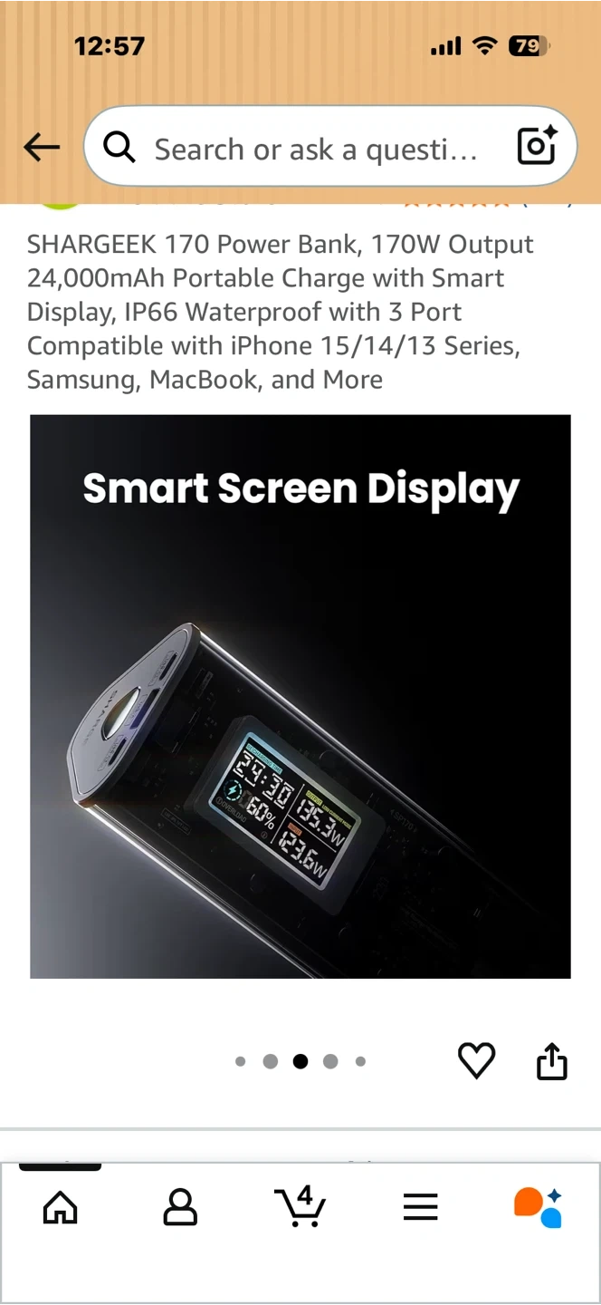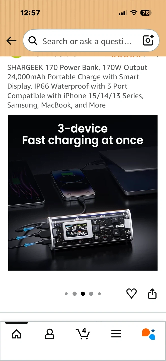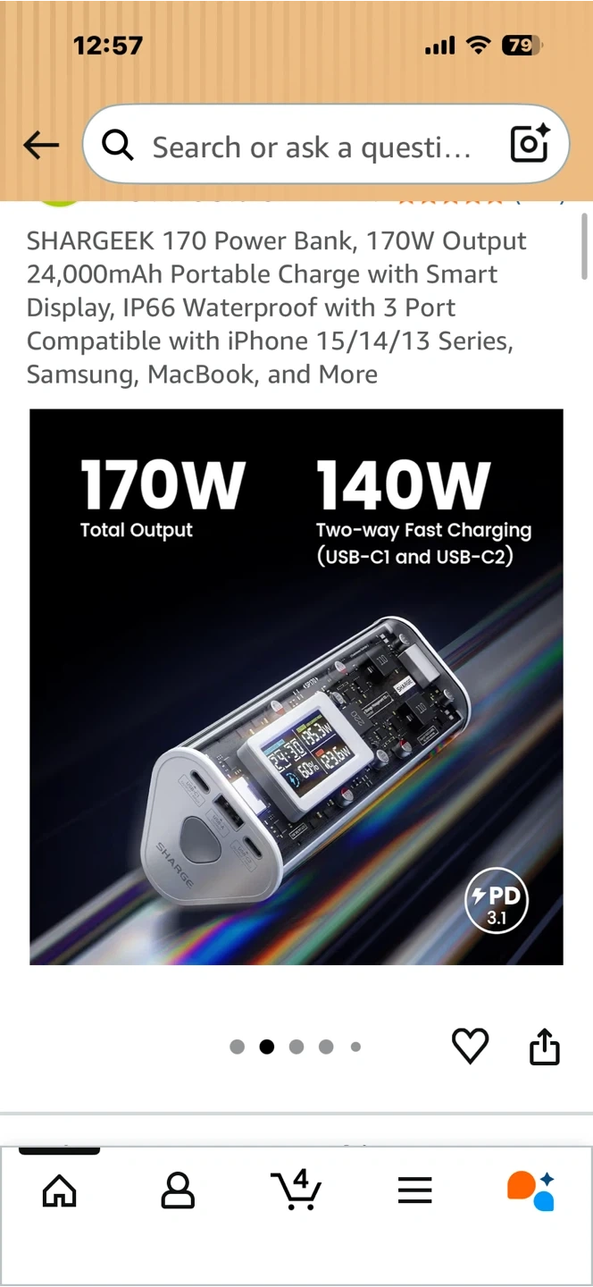 This SHARGEEK 170 power bank offers a 24,000mAh capacity and 170W total output. It features a smart display and is IP66 waterproof and dustproof. It has 3 ports for charging multiple devices. This power bank is suitable for charging laptops, phones, and other electronics on the go.