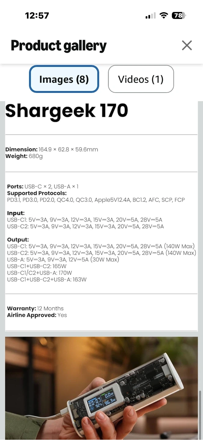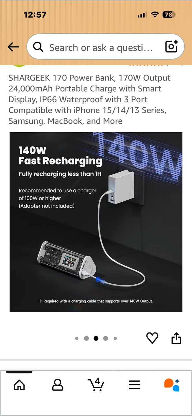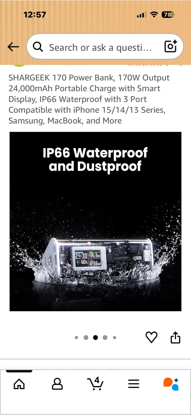This SHARGEEK 170 power bank offers a 24,000mAh capacity and 170W total output. It features a smart display and is IP66 waterproof and dustproof. It has 3 ports for charging multiple devices. This power bank is suitable for charging laptops, phones, and other electronics on the go.
