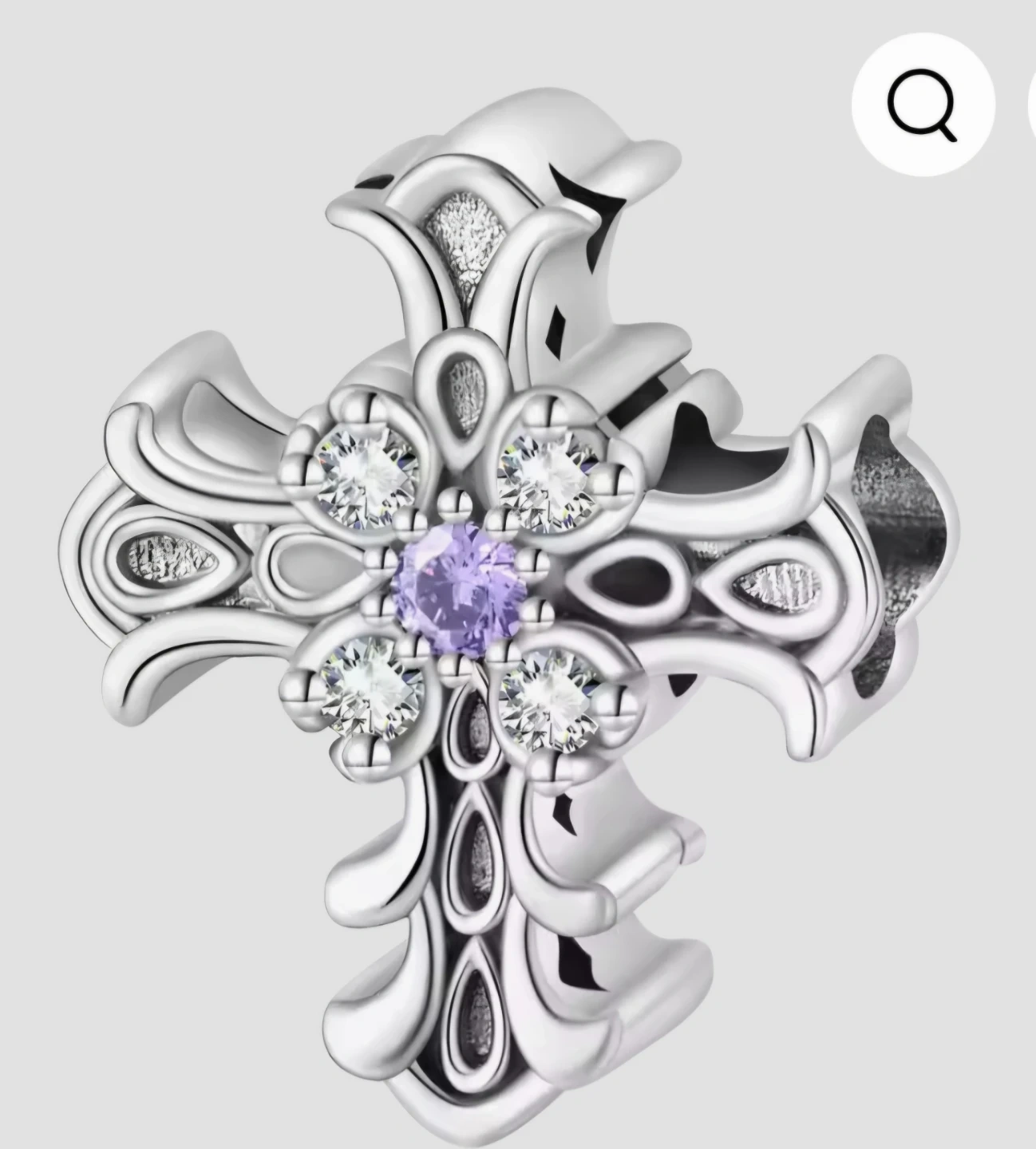 Selling a beautiful sterling silver cross charm! It features an intricate design with a purple gemstone at the center and sparkling clear stones around it. Perfect for adding a touch of elegance to any bracelet or necklace