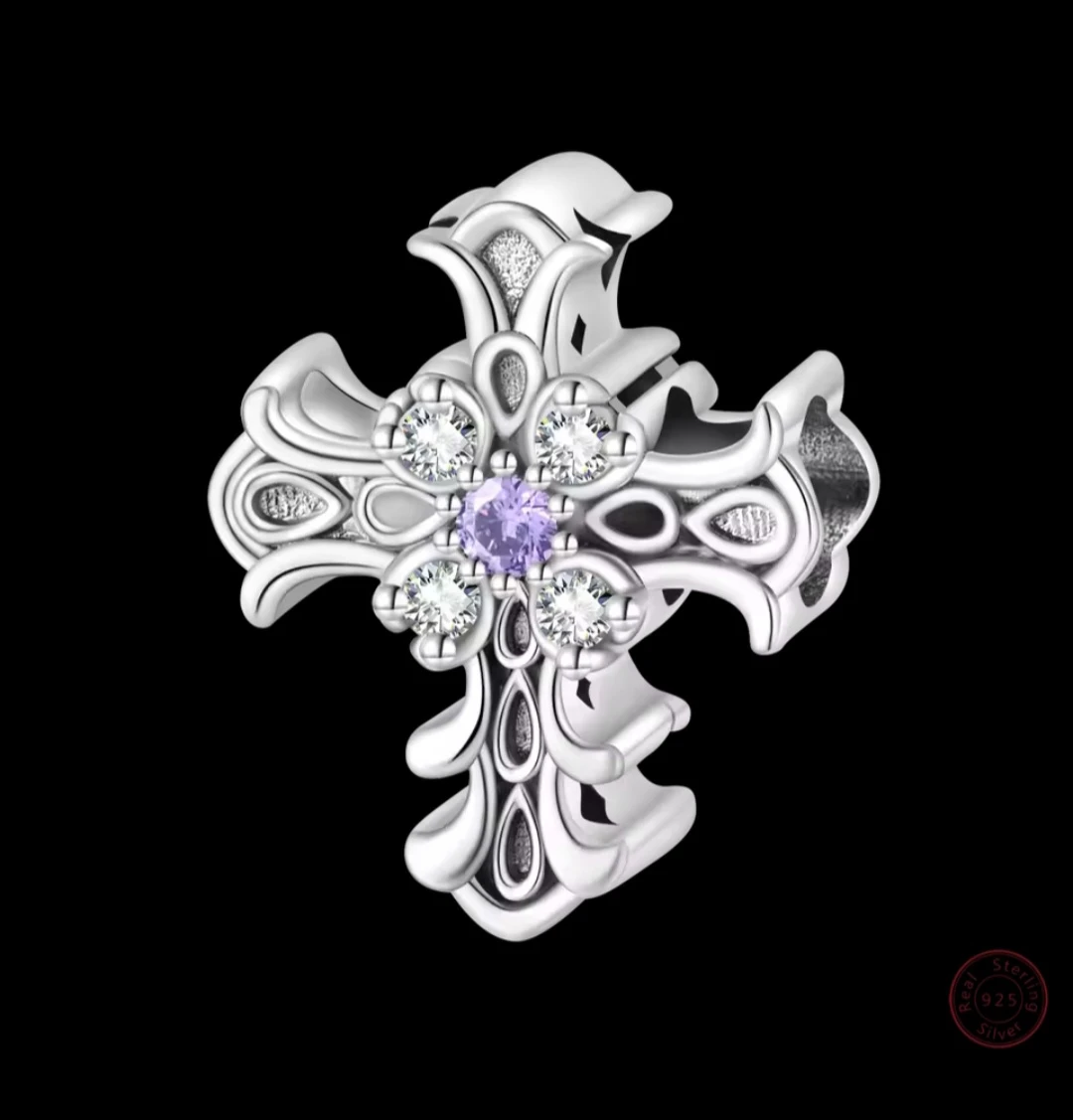 Selling a beautiful sterling silver cross charm! It features an intricate design with a purple gemstone at the center and sparkling clear stones around it. Perfect for adding a touch of elegance to any bracelet or necklace