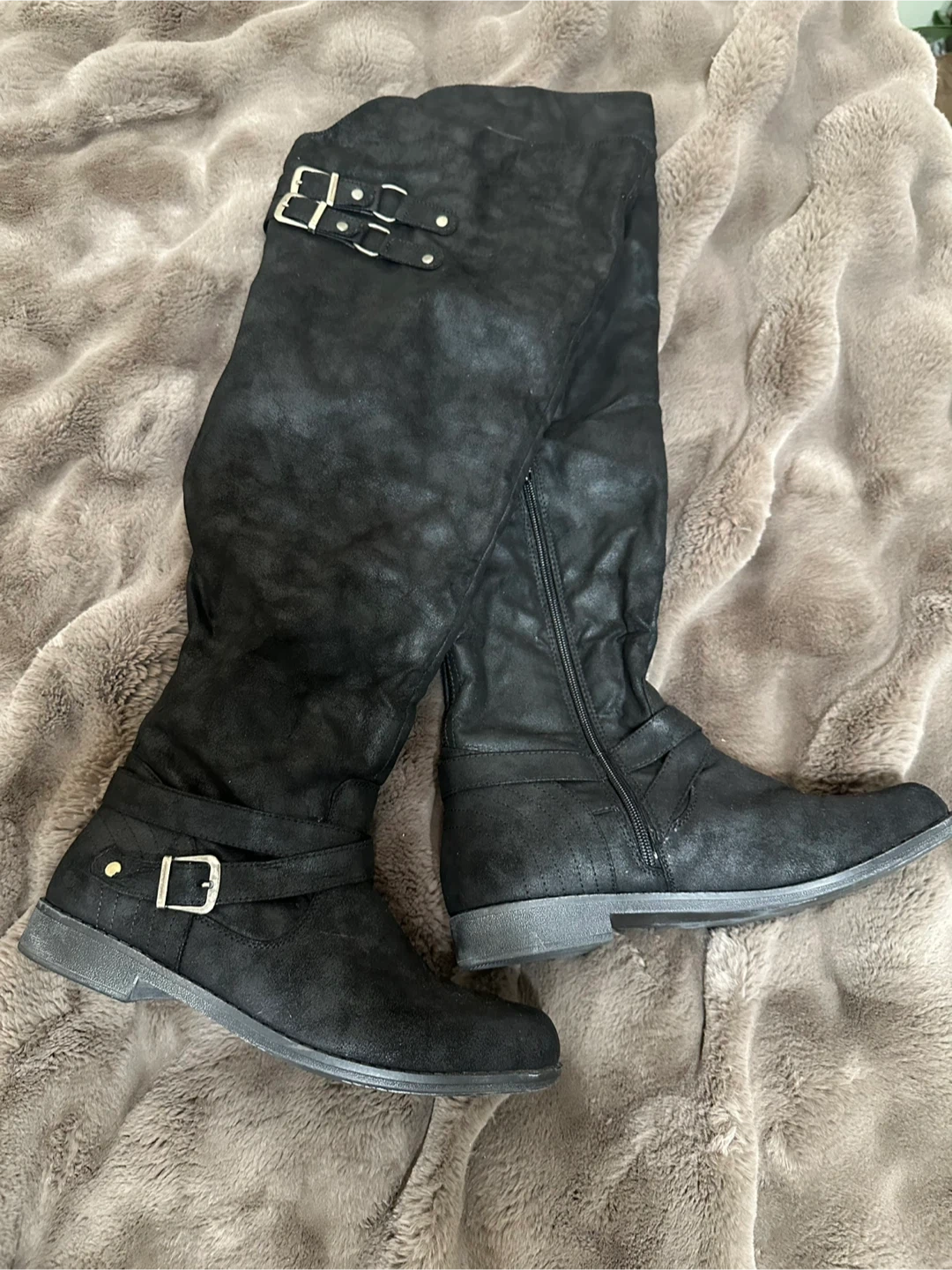 These black knee-high boots feature a comfortable slouch design and decorative buckle accents. They have a side zipper for easy on and off. Pair them with jeans or a skirt for a stylish look