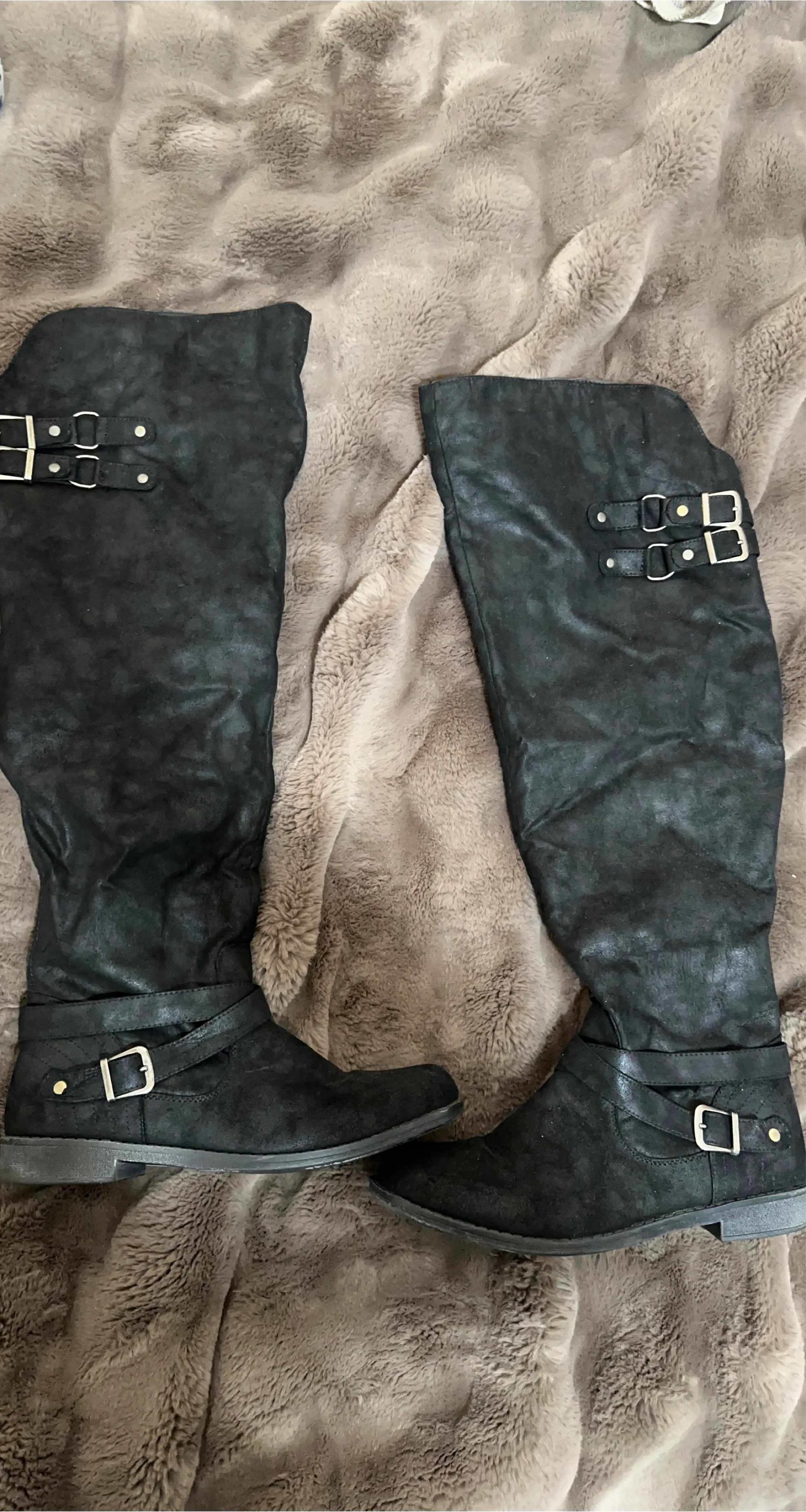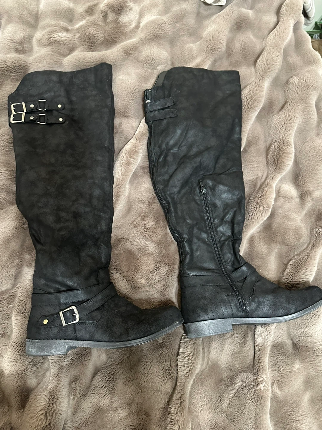 These black knee-high boots feature a comfortable slouch design and decorative buckle accents. They have a side zipper for easy on and off. Pair them with jeans or a skirt for a stylish look