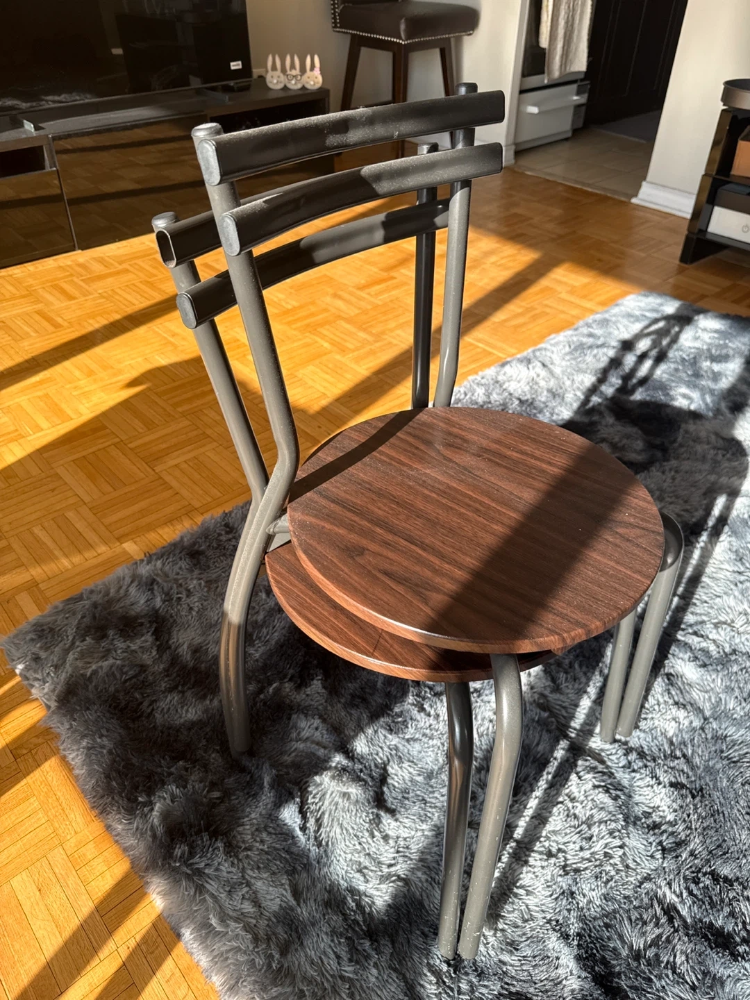 This chair has a round wood seat with a dark wood grain finish. It features a slim, grey metal frame and backrest. It's a nice accent piece for any room.