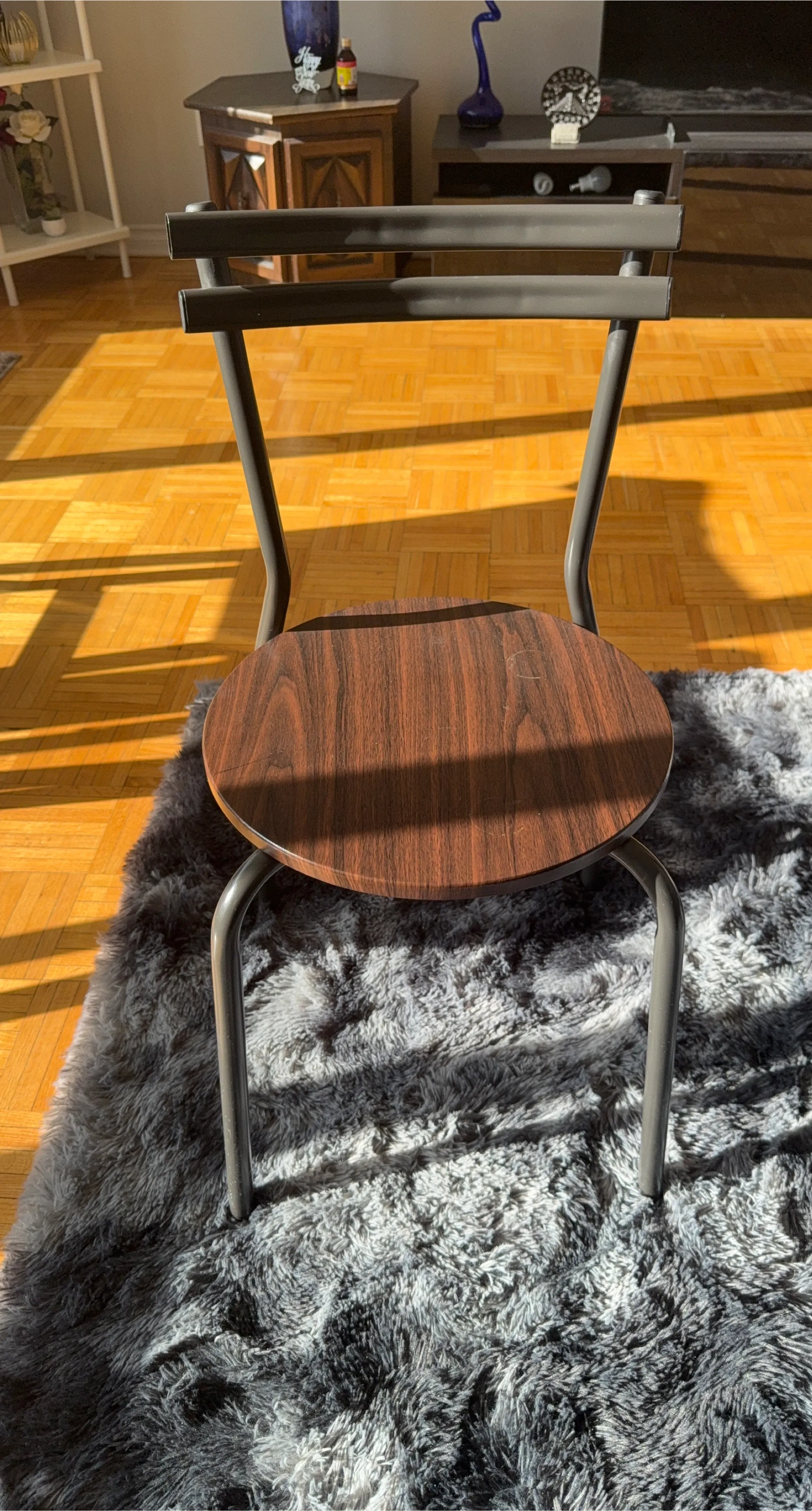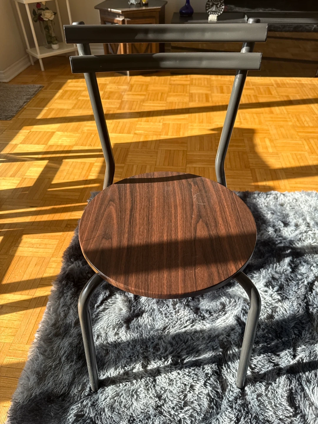 This chair has a round wood seat with a dark wood grain finish. It features a slim, grey metal frame and backrest. It's a nice accent piece for any room.