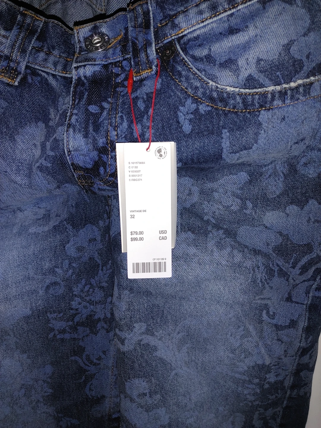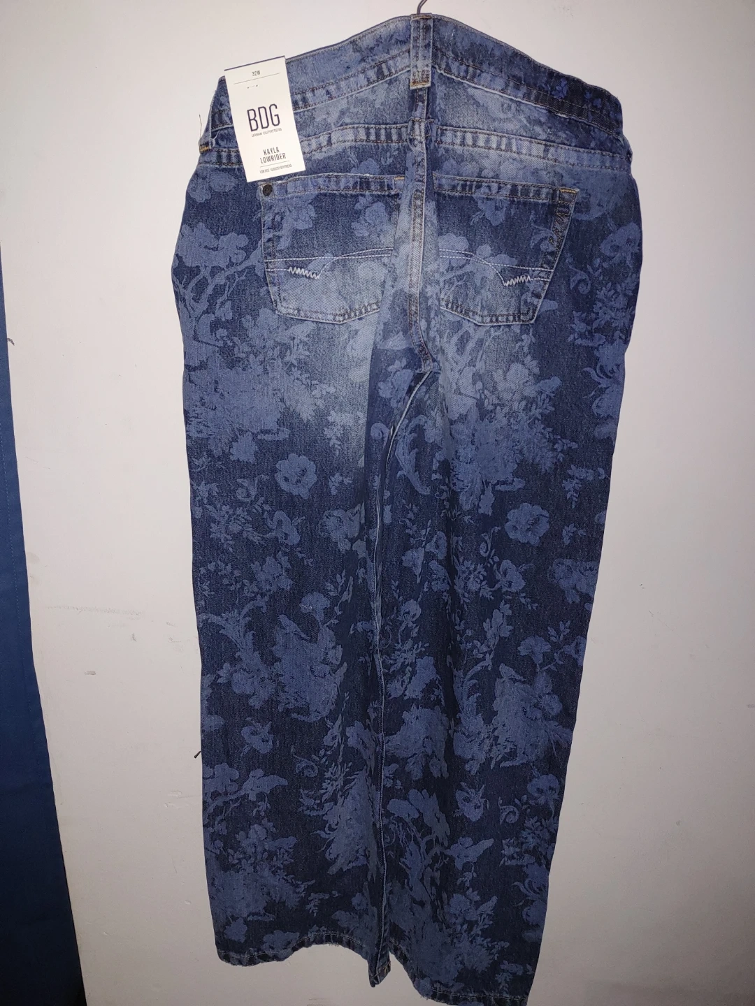 Selling a pair of BDG 'Vintage DE' jeans in size 32. They feature a unique floral pattern. These jeans were originally bought for $99 CAD!