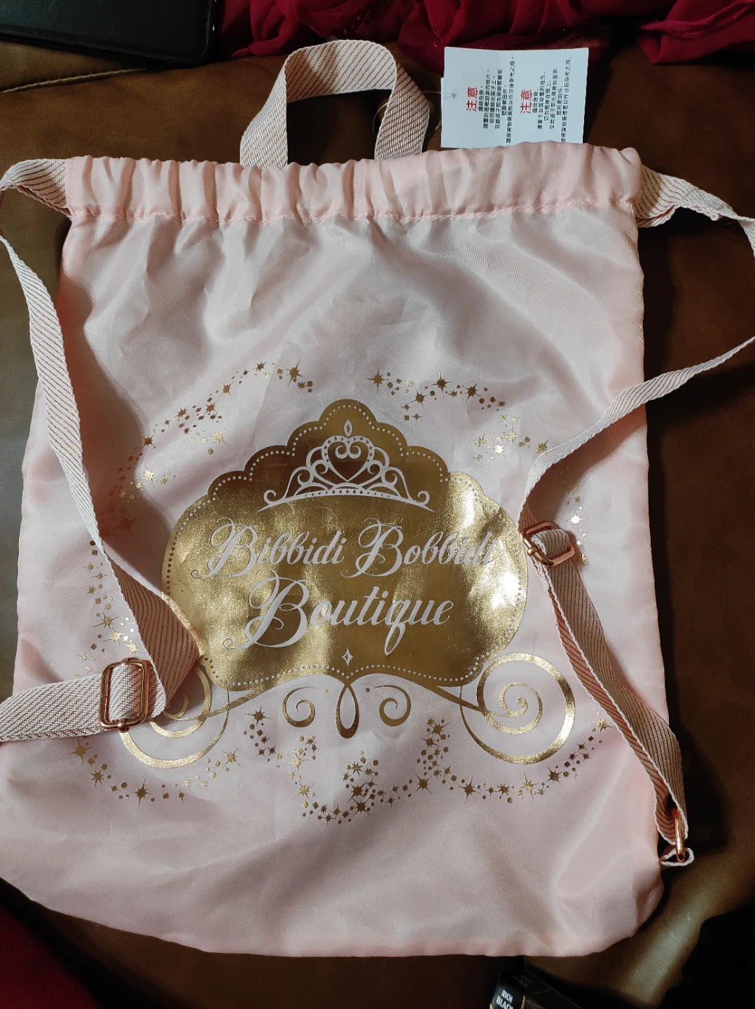 This pink drawstring bag features the 'Bibbidi Bobbidi Boutique' design. It's made of a lightweight, shimmery fabric. The bag has adjustable shoulder straps and a cinched top closure. Perfect for carrying essentials for little ones!