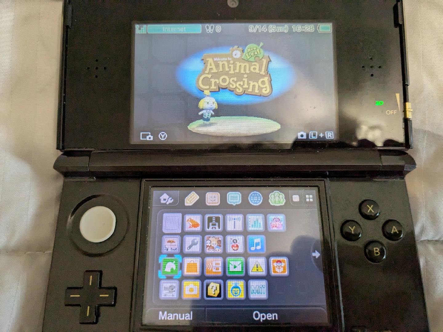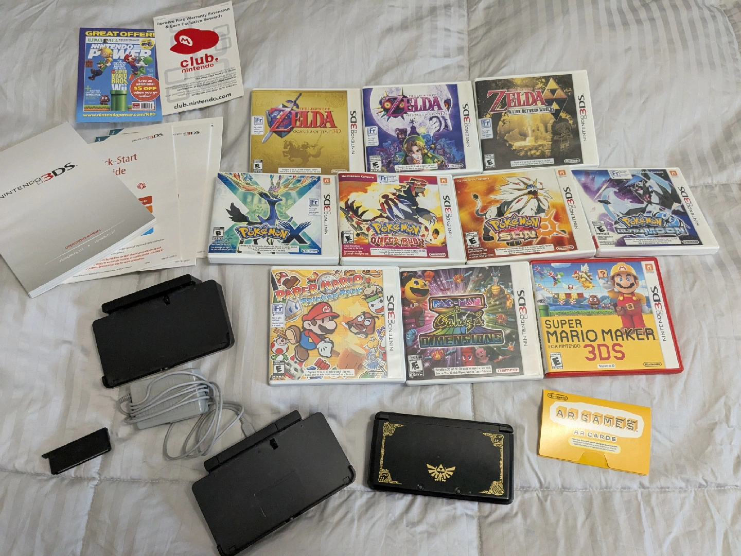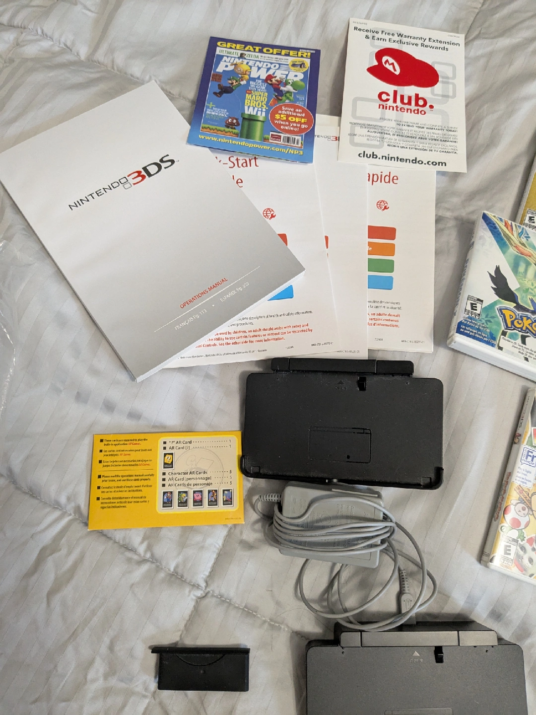 Comes with everything shown as is. 3DS is in very loved/used condition, still works perfectly but the rubber of the analog stick has fallen off, and the bottom screen was replaced at one point. the charger included works with the charging port it's connected to but is slightly bent out of shape so doesn't charge directly to the 3ds. has Animal Crossing New Leaf included as a digital game, as well as Zelda 1 and Super Mario Land 2.