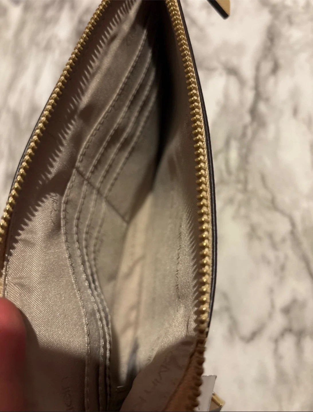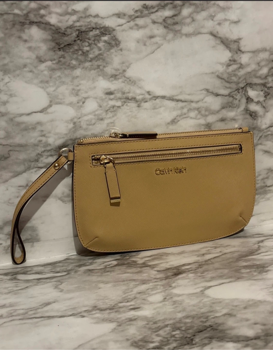 Elevate your accessory game with this stylish and compact Calvin Klein wristlet in a sophisticated tan colour, perfect for carrying your essentials with ease. The wristlet features a convenient zip-top closure and a front zip pocket, offering secure storage for your valuables while on the go.