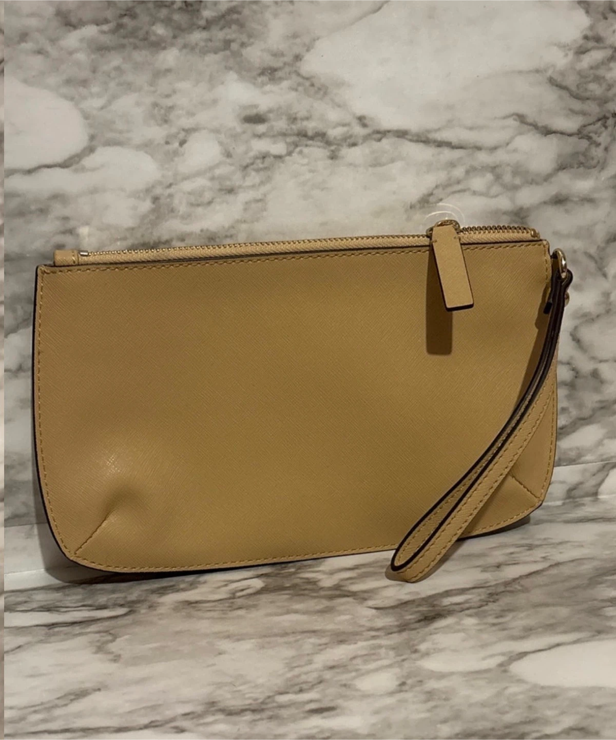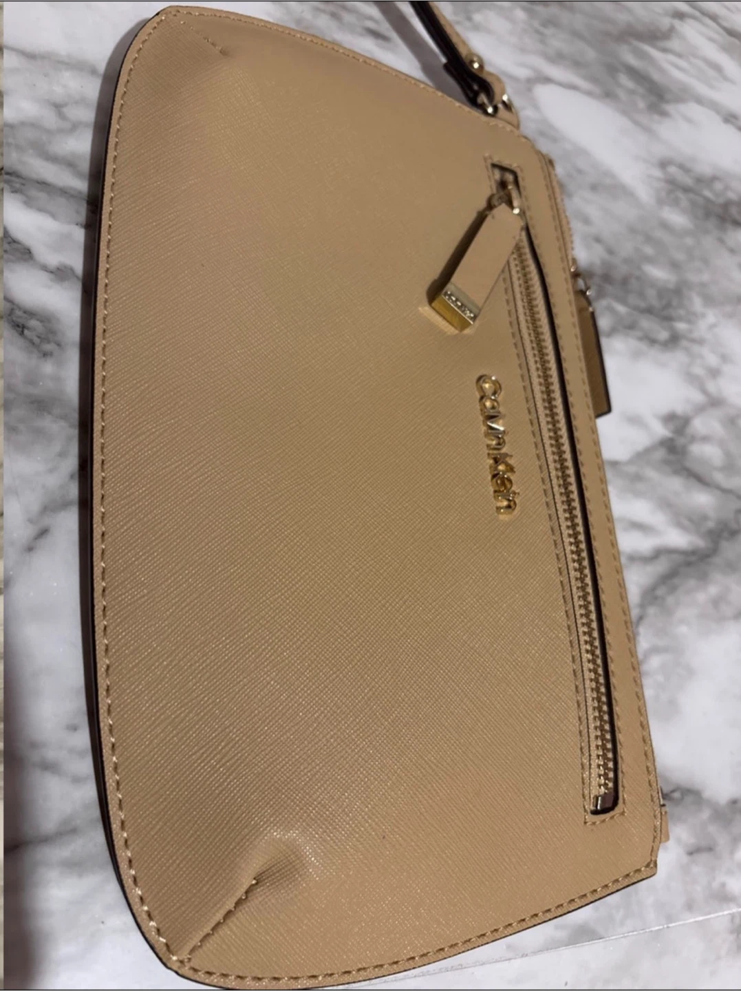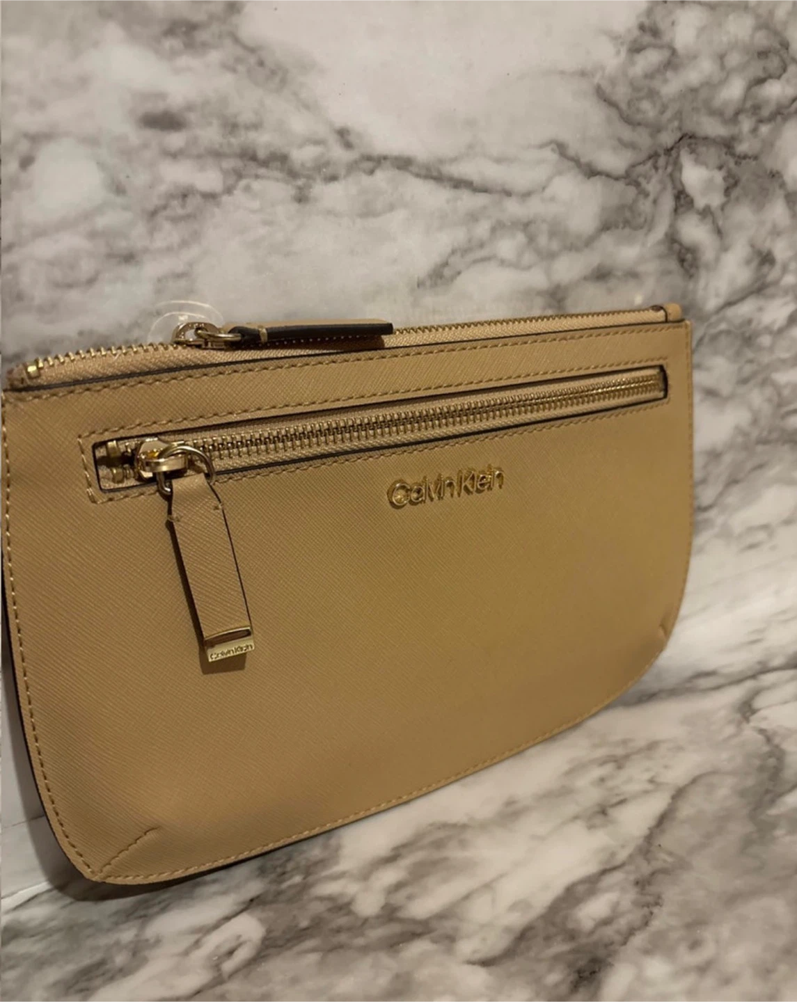Elevate your accessory game with this stylish and compact Calvin Klein wristlet in a sophisticated tan colour, perfect for carrying your essentials with ease. The wristlet features a convenient zip-top closure and a front zip pocket, offering secure storage for your valuables while on the go.