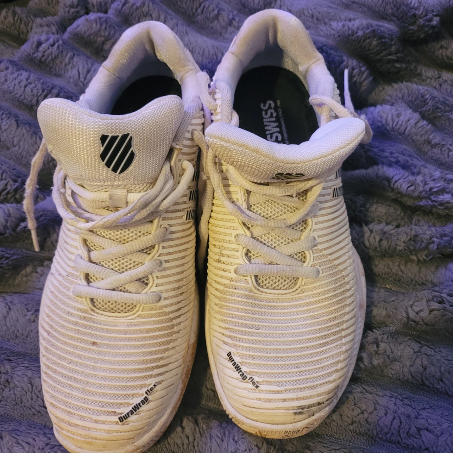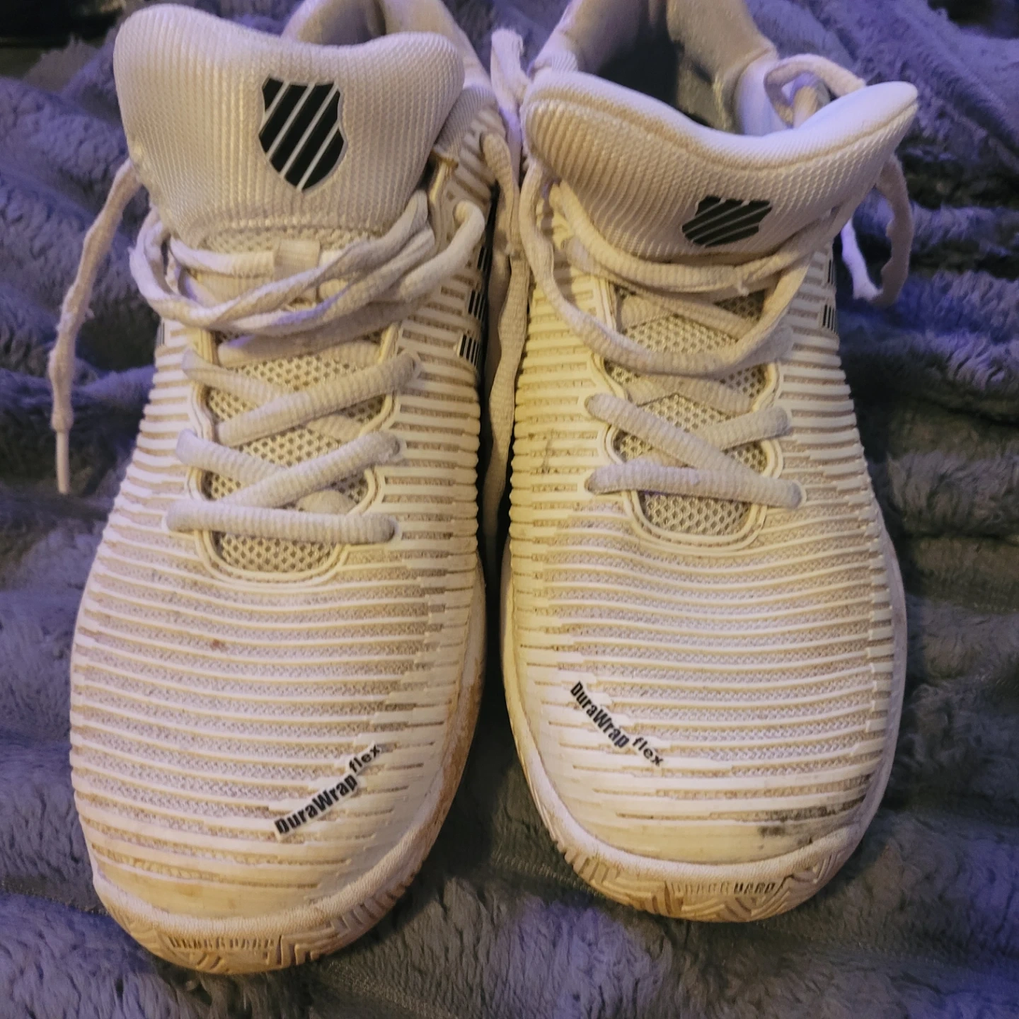 These K-Swiss tennis shoes are white and a men's size 9.5. They feature DuraWrap flex technology. Made in China.