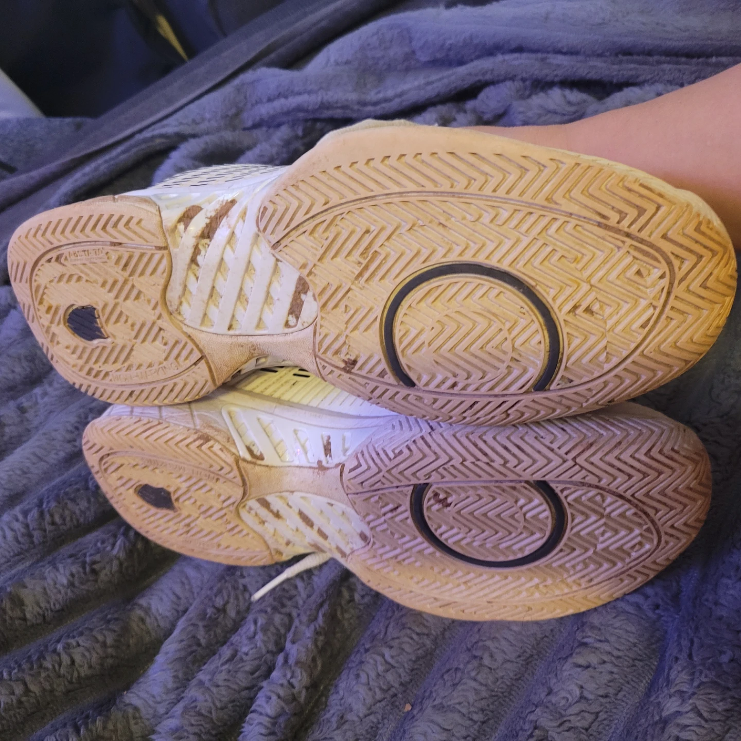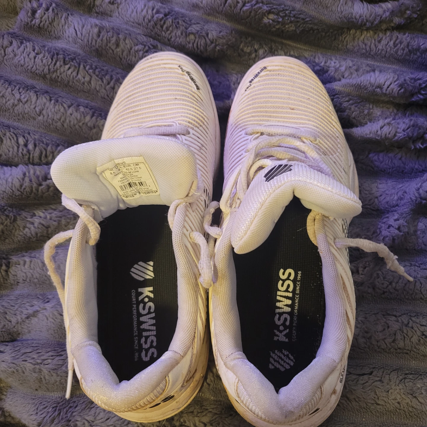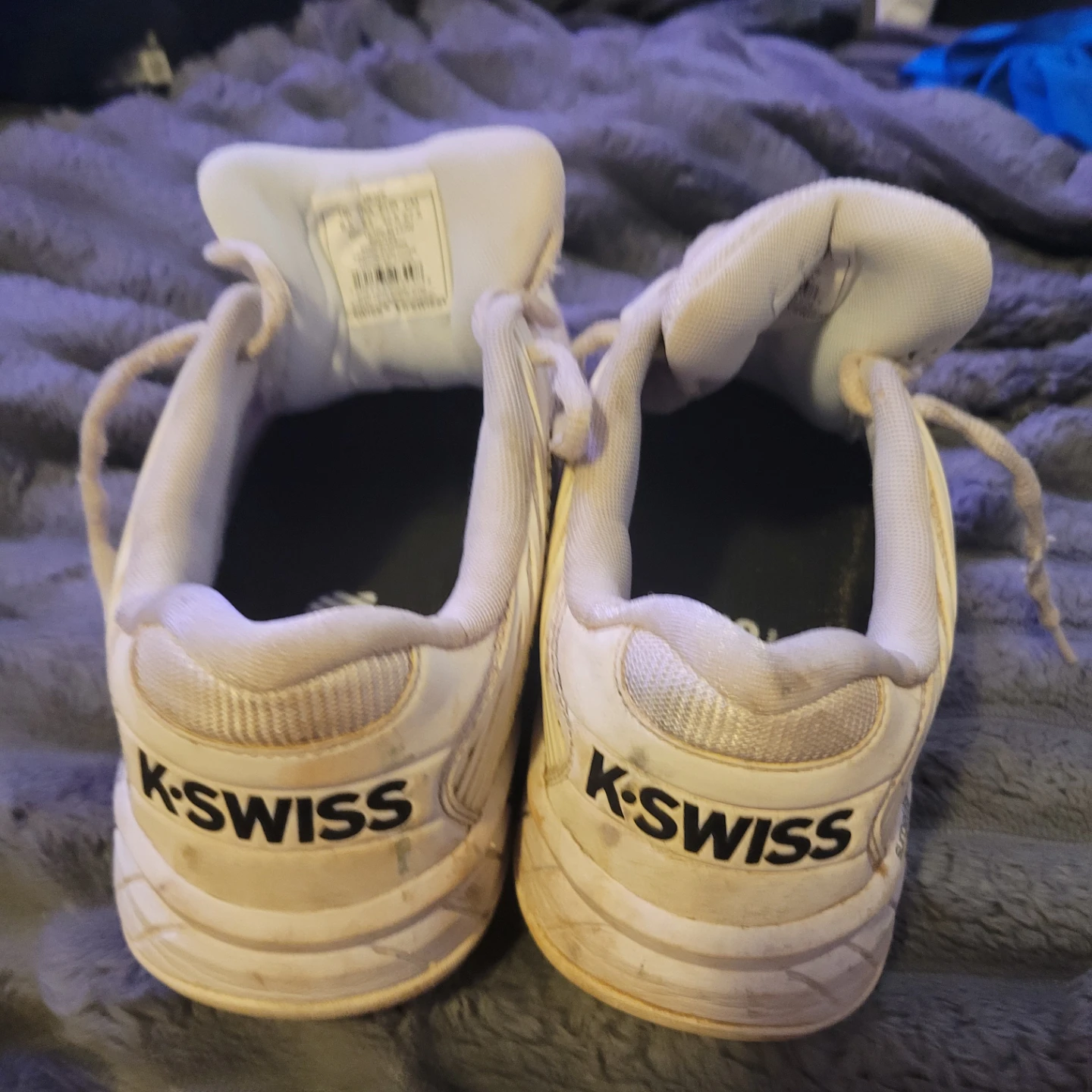 These K-Swiss tennis shoes are white and a men's size 9.5. They feature DuraWrap flex technology. Made in China.