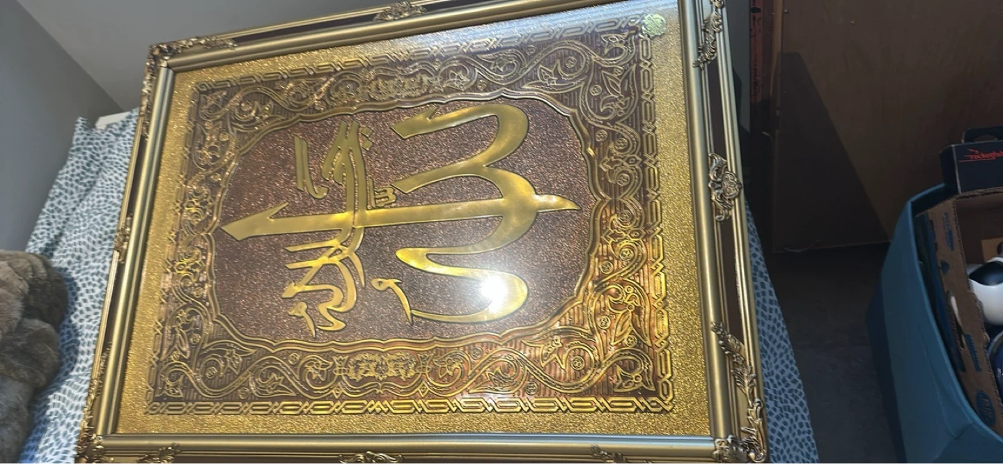 Beautifully framed Islamic calligraphy artwork. Features intricate gold detailing on a textured brown background. It's ready to hang and add a touch of elegance to any room.