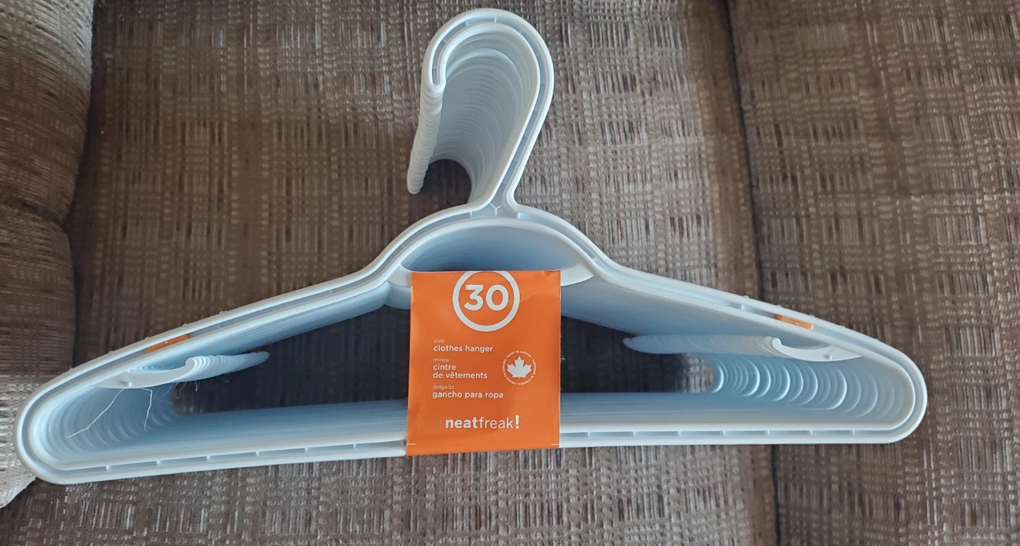 Neatfreak slim clothes hangers, comes in a pack of 30. Made in Canada. These hangers are white plastic and space-saving. Bought new and never used. Cash pickup from Hamilton Ontario