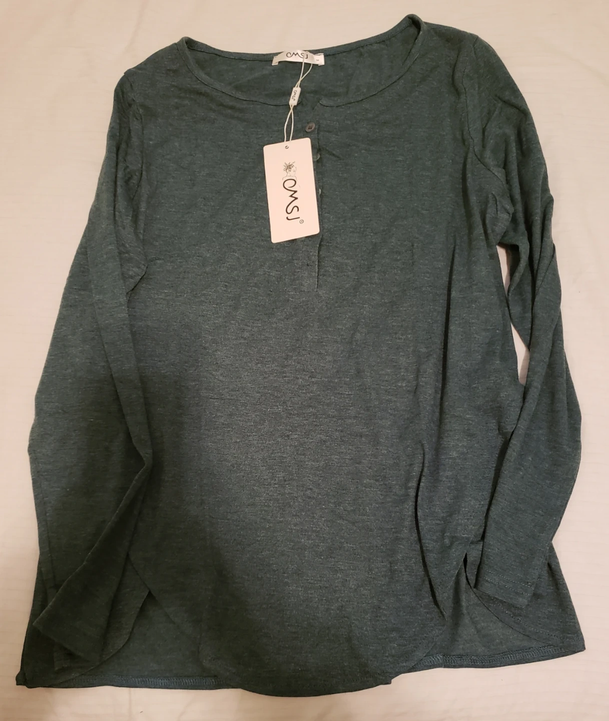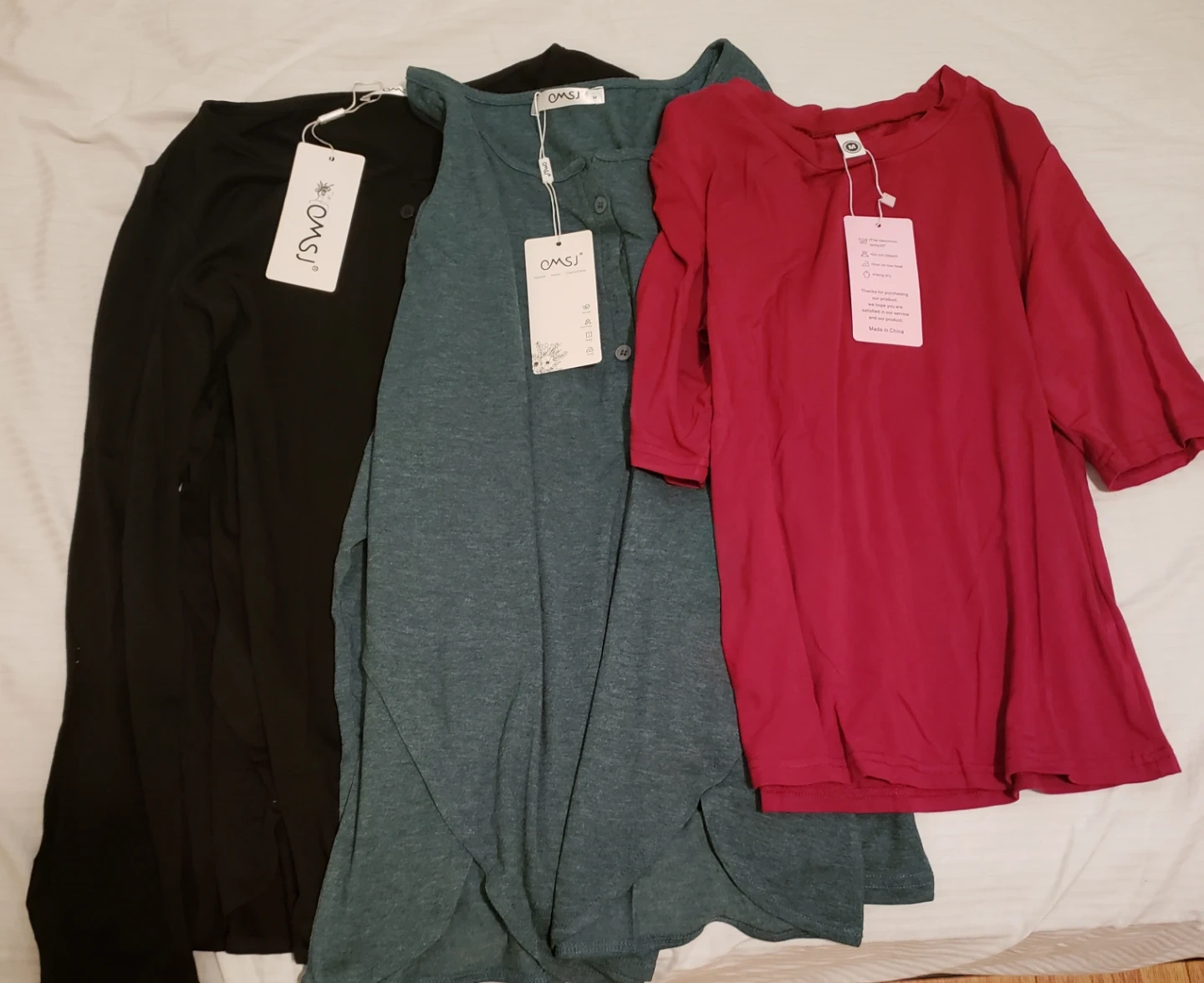 Three women's tops from OMSI. Includes one black long-sleeve shirt, one teal long-sleeve shirt with buttons, and one red short-sleeve shirt. Made from a soft, breathable fabric. Great for everyday wear!take all for $15