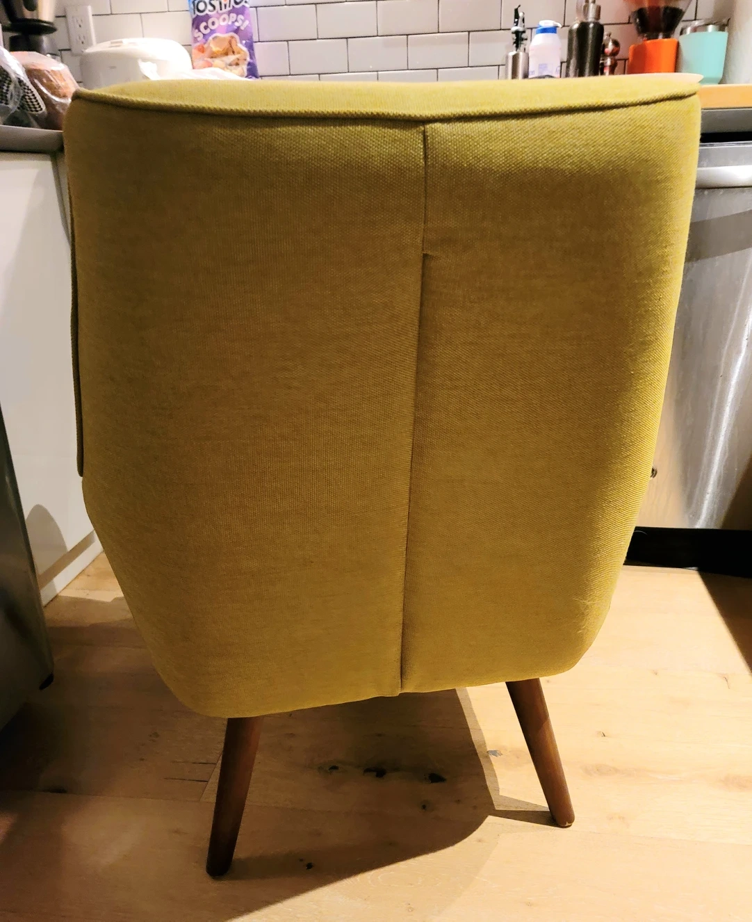 Purchased from Urban Barn in 2018, this arm chair is comfortable, supportive and a lovely shade of chartreuse.
