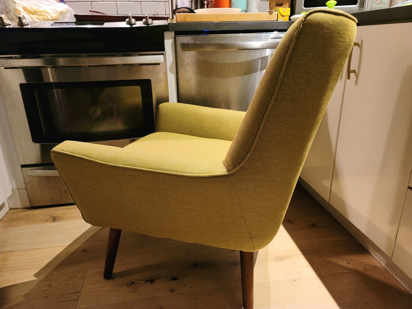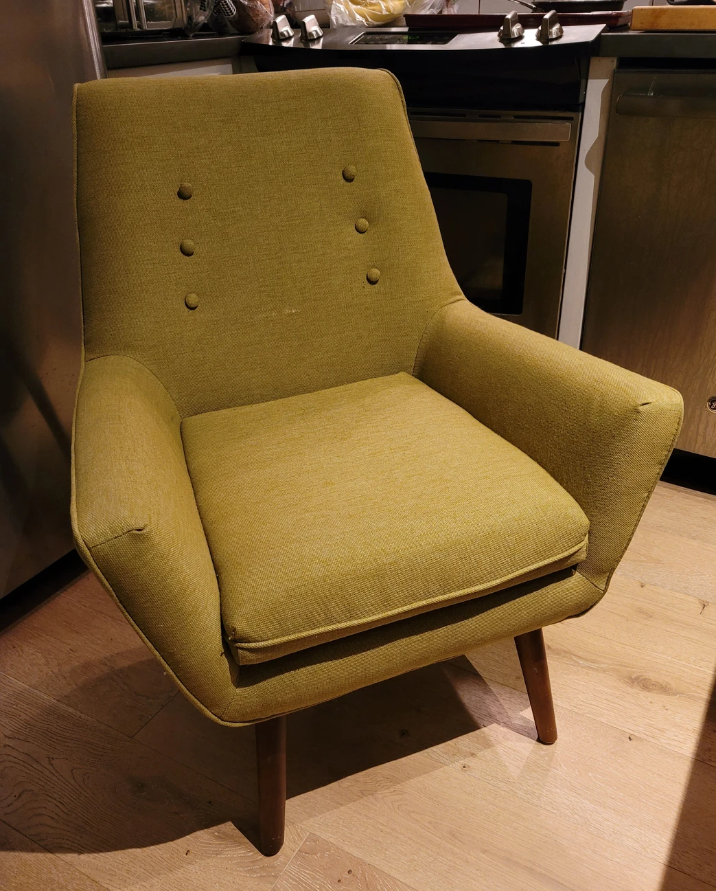 Purchased from Urban Barn in 2018, this arm chair is comfortable, supportive and a lovely shade of chartreuse.