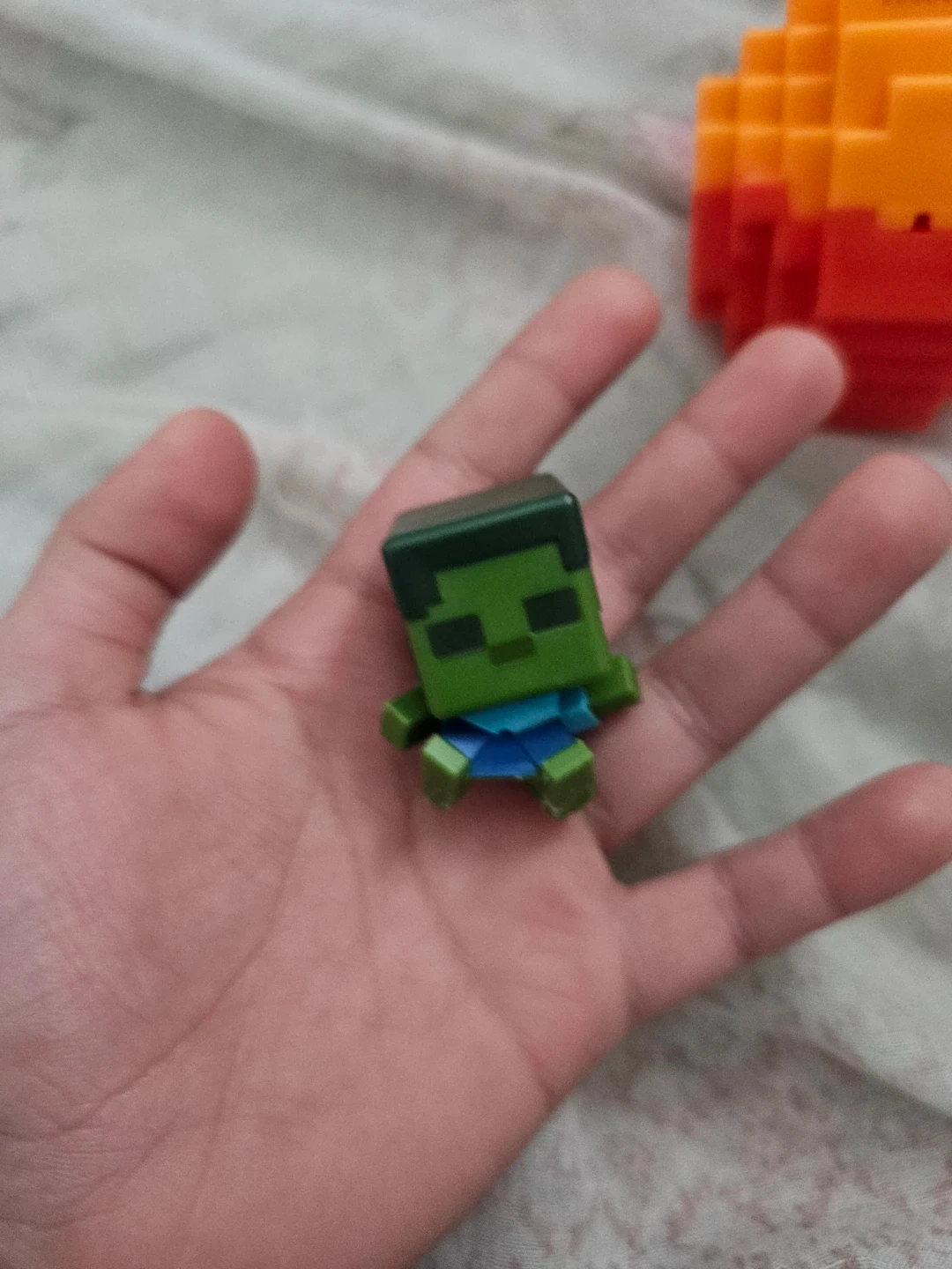 A cute, pixelated Minecraft zombie toy figure. It's green with a blue shirt. This mini collectible is perfect for any Minecraft fan's desk or display shelf!