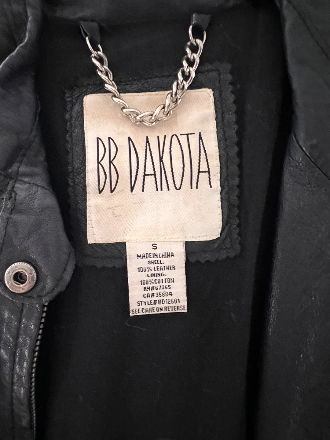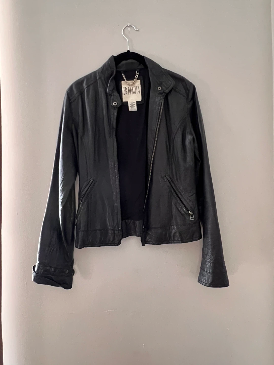 Selling a gently used BB Dakota leather jacket in black. It's a size small and made of 100% leather shell with cotton lining. Perfect for adding a stylish edge to any outfit!