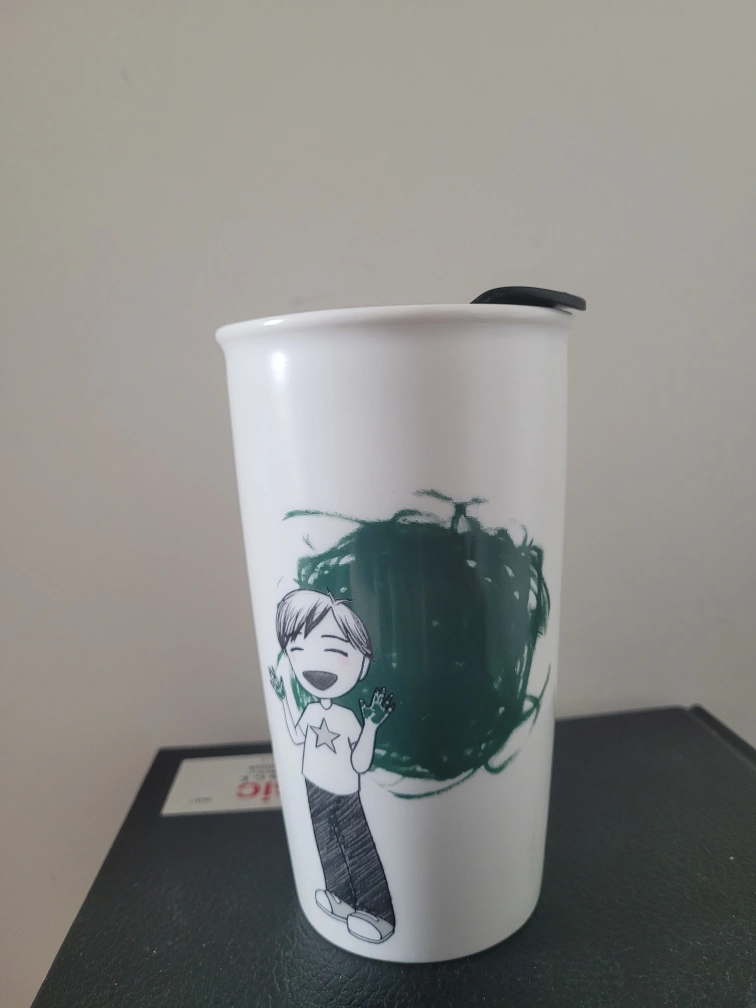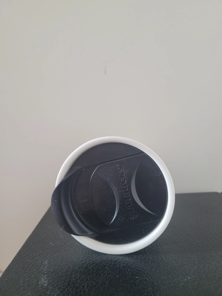 Selling a Starbucks white tumbler, holds 12 fl oz / 355 ml. It has a black lid and a fun design on it!