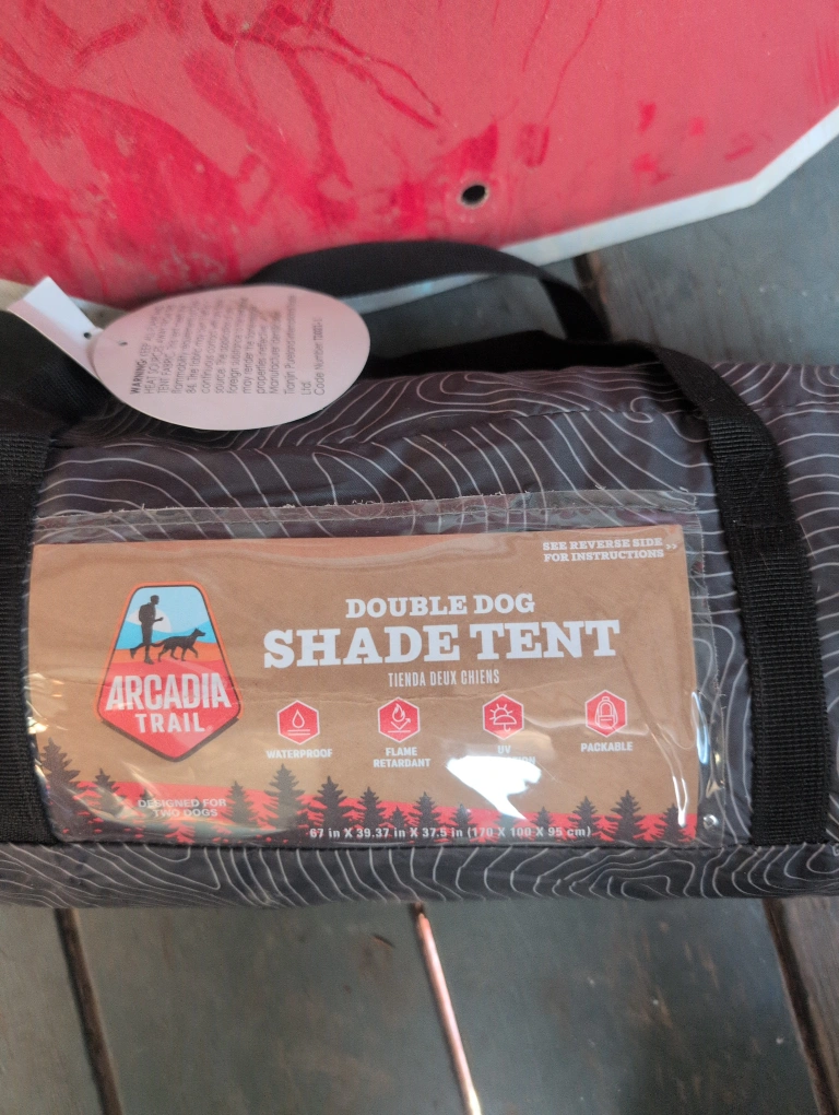 Double dog shade tent. Waterproof, flame retardant, UV resistant, and packable. Designed for two dogs. Measures 67" x 39.37" x 37.5".