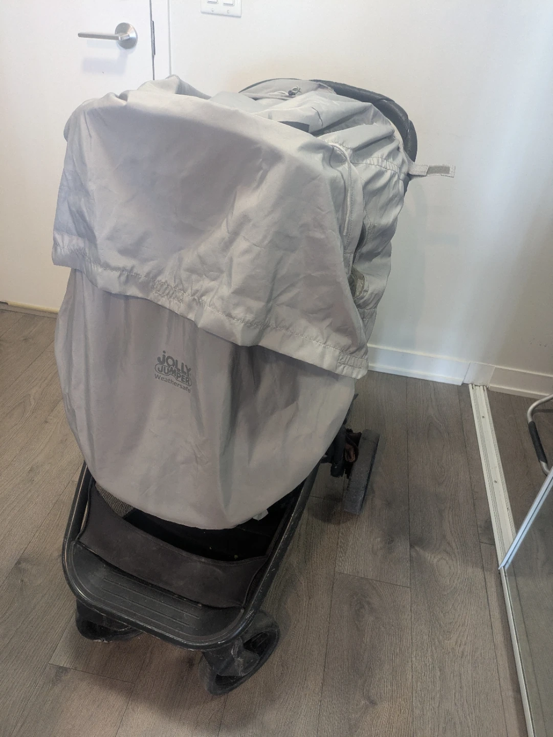 Stroller plus This Jolly Jumper Weathersafe cover is grey and designed to protect your stroller. It's made from water-resistant material for keeping little ones dry! The cover fits most standard strollers.