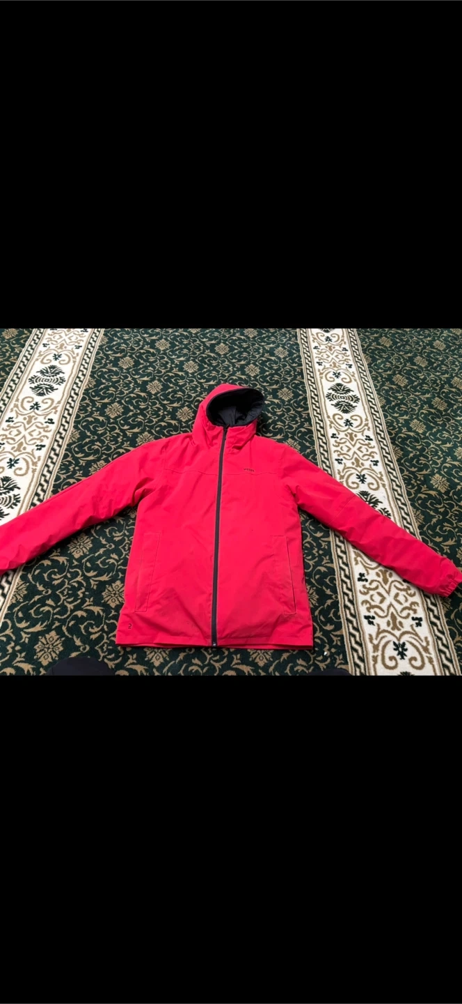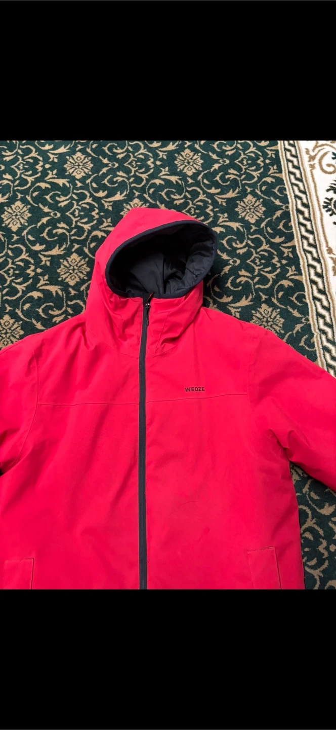 This is a red hooded jacket from Wedze. It's made of polyester and features a full zip closure with two front pockets.