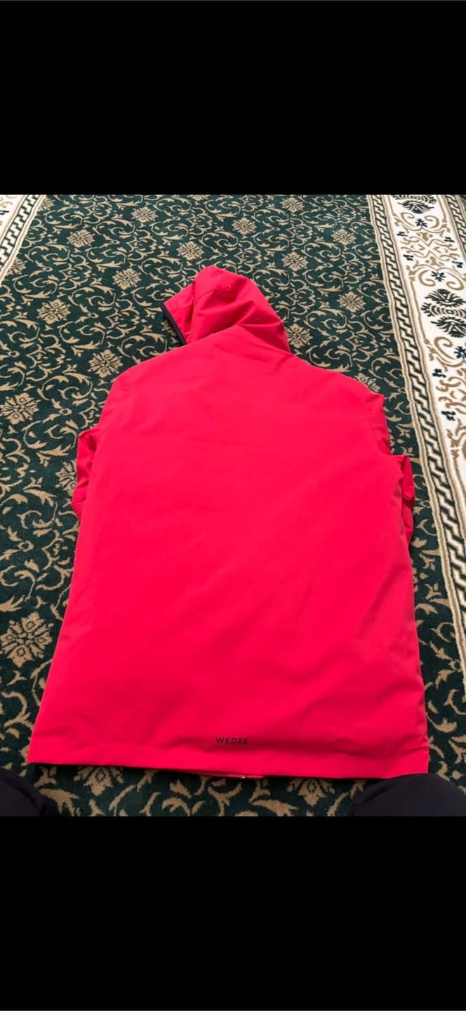 This is a red hooded jacket from Wedze. It's made of polyester and features a full zip closure with two front pockets.