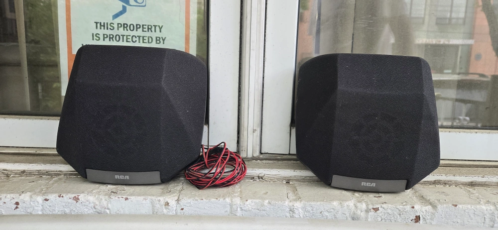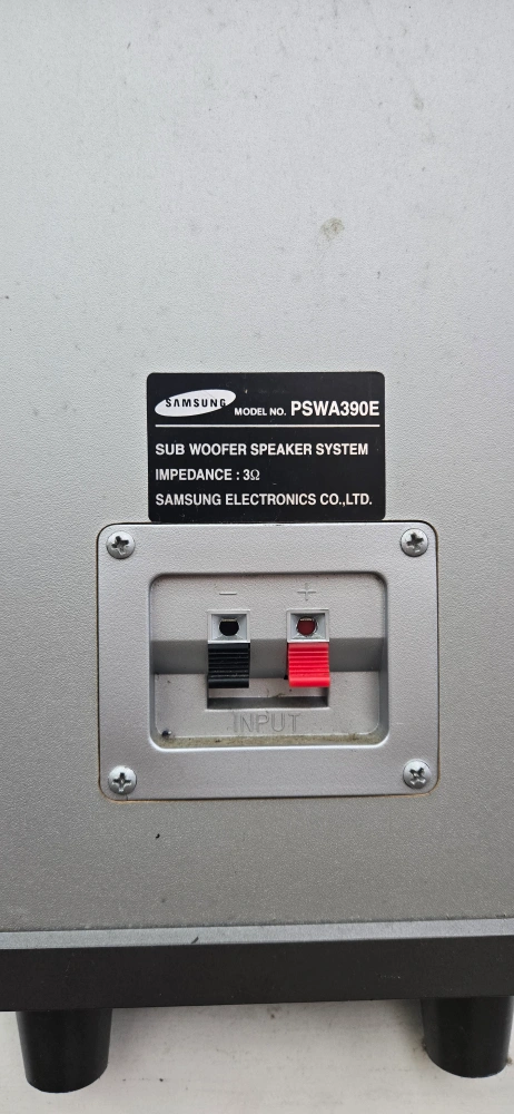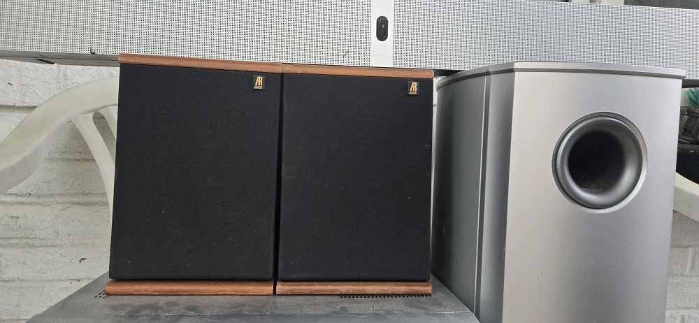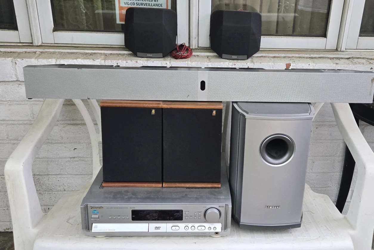 5.1 home theater system. Includes two pairs of satellite speakers, a subwoofer, a soundbar, and a receiver. RCA and Acoustic Research brands present. Subwoofer model number PSWA390E. Great for home entertainment.