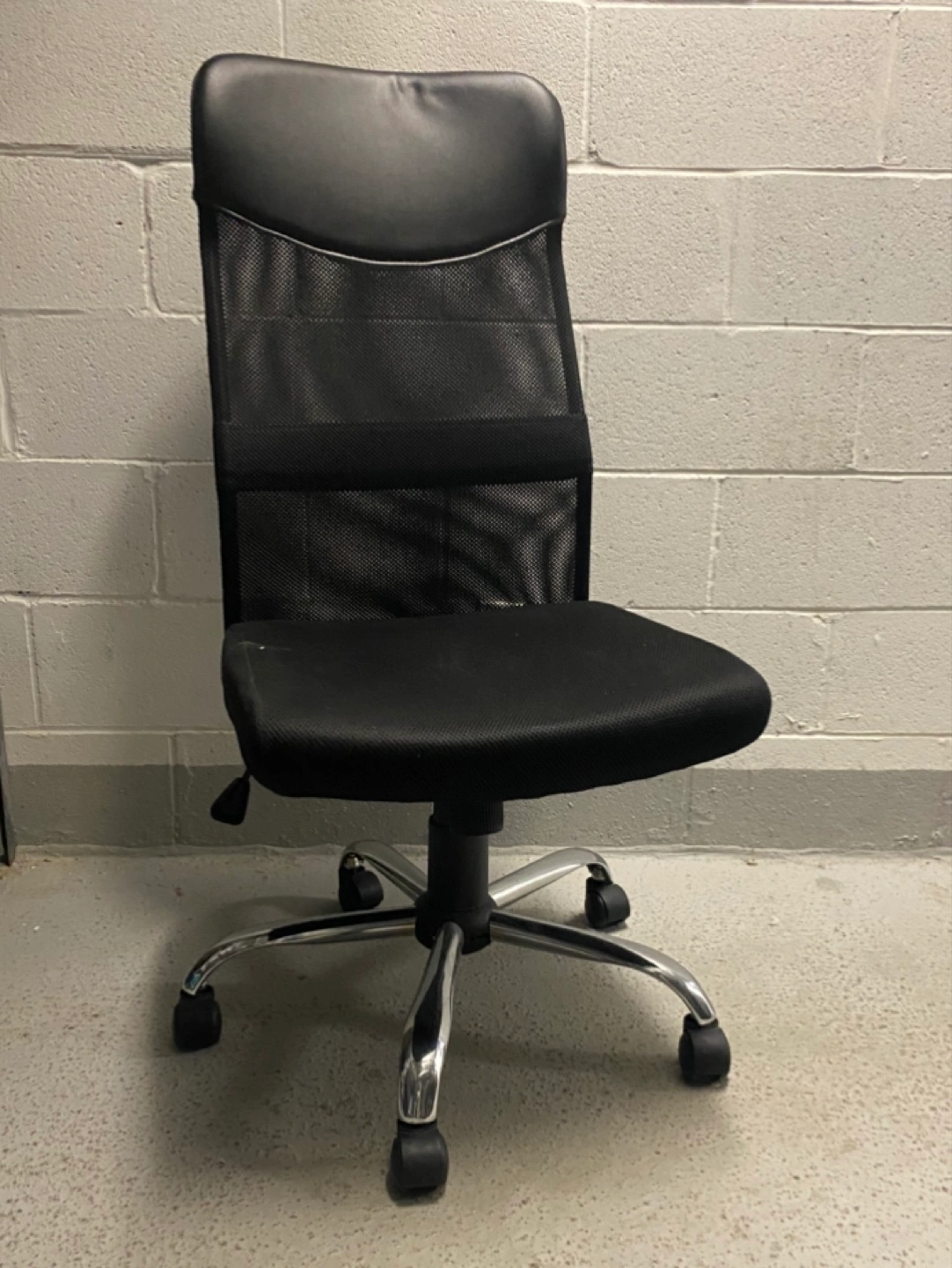 Selling a black office chair in good condition. It has a mesh back and a padded seat for comfort. The chair also has wheels for easy movement