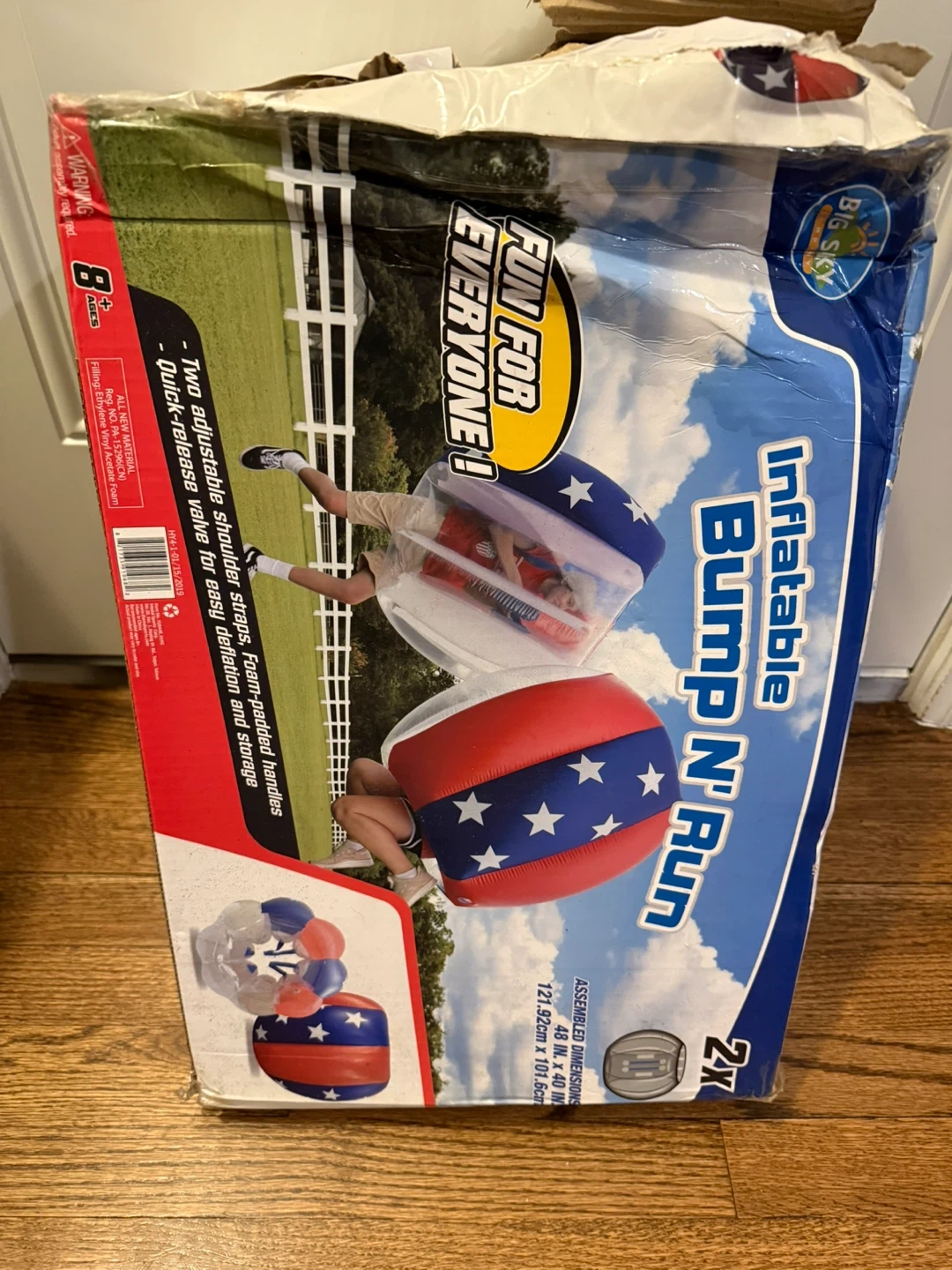 Get ready for some outdoor fun with this Big Sky Inflatable Bump N' Run set! It's designed for everyone and comes with two adjustable shoulder straps and foam-padded handles for a comfortable and secure fit. The quick-release valve makes inflation and deflation a breeze. The assembled dimensions are 48 in x 40 in, or 121.92cm x 101.6cm. Box included!