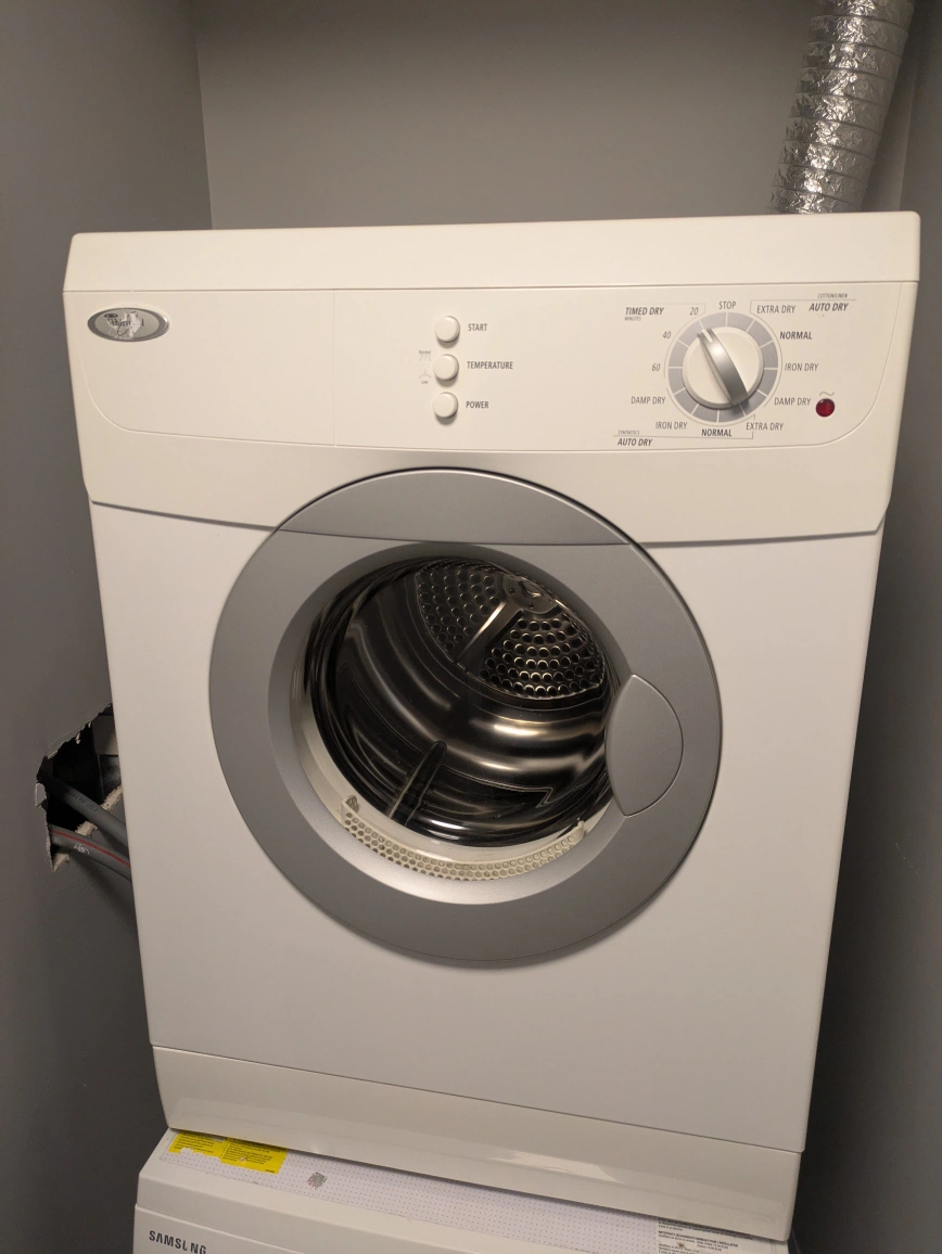 32Selling a Whirlpool compact electric dryer. It's in good working condition and perfect for smaller spaces like apartments or condos. It features timed dry, temperature settings, and auto dry options. Great for anyone needing a space-saving laundry solution. There is a minor issue of the door not closing if you can get that fixed then it works great.