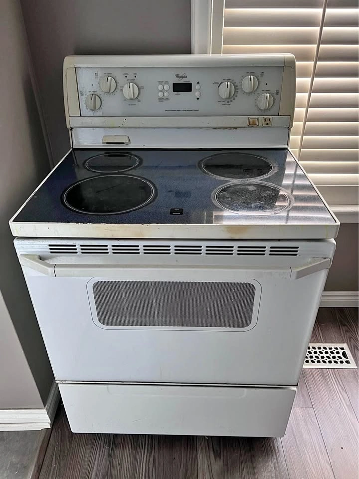 10First thing first, glass top has cracks, cracks cover one front burner only but itβs goes the whole top to bottom. And oven glass is broken from one side but oven works fine.π All the burners works. Just need to change the glass top and might need a fresh coat of paint.π