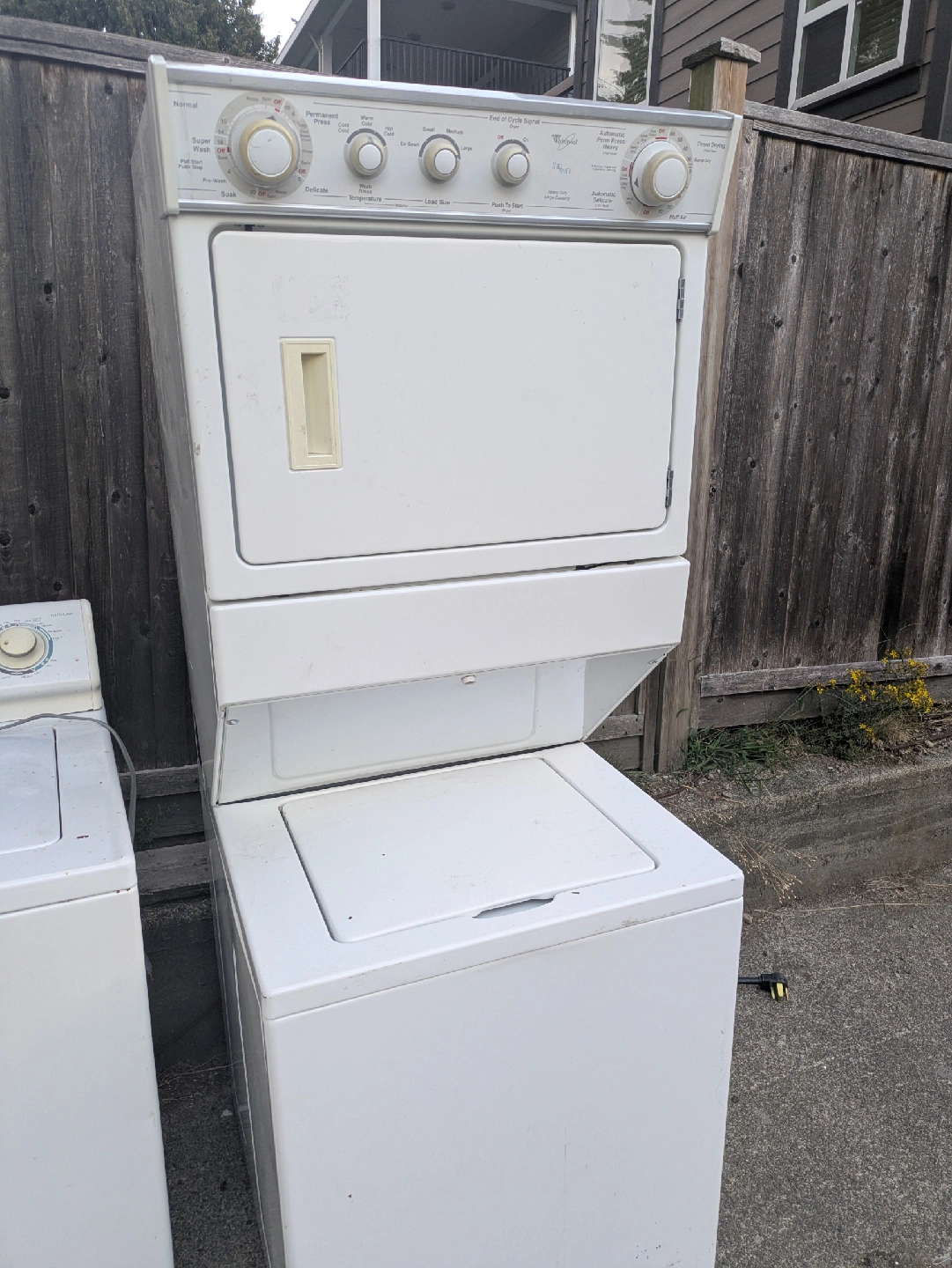 15Selling a fully rebuilt Whirlpool thin twin stacker washer and dryer unit. It's white and has standard settings like 'Normal', 'Permanent Press', and 'Delicate'. The dryer also has an 'End of Cycle Signal' feature. Great for saving space!