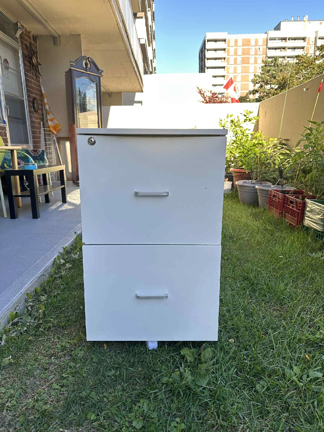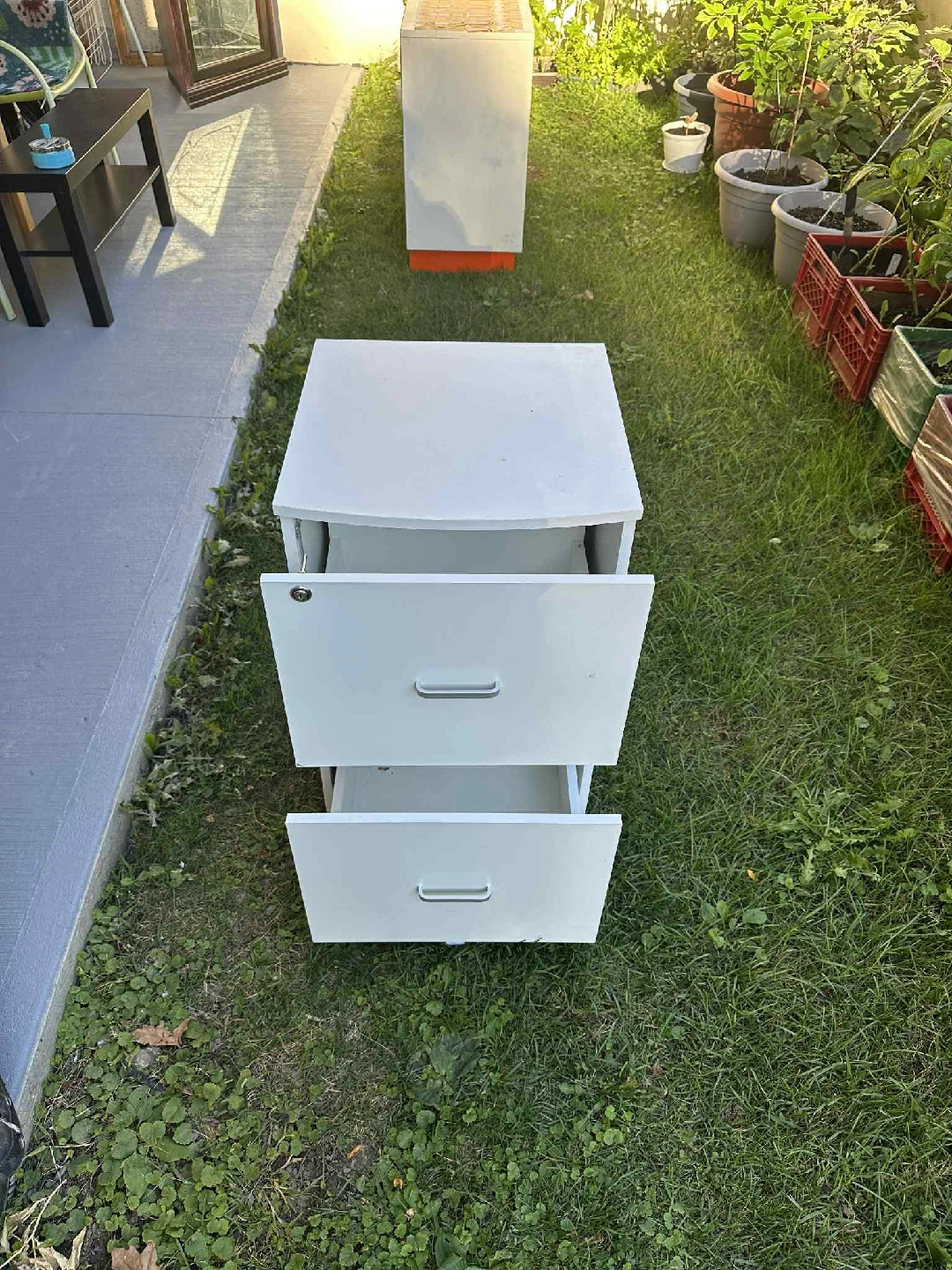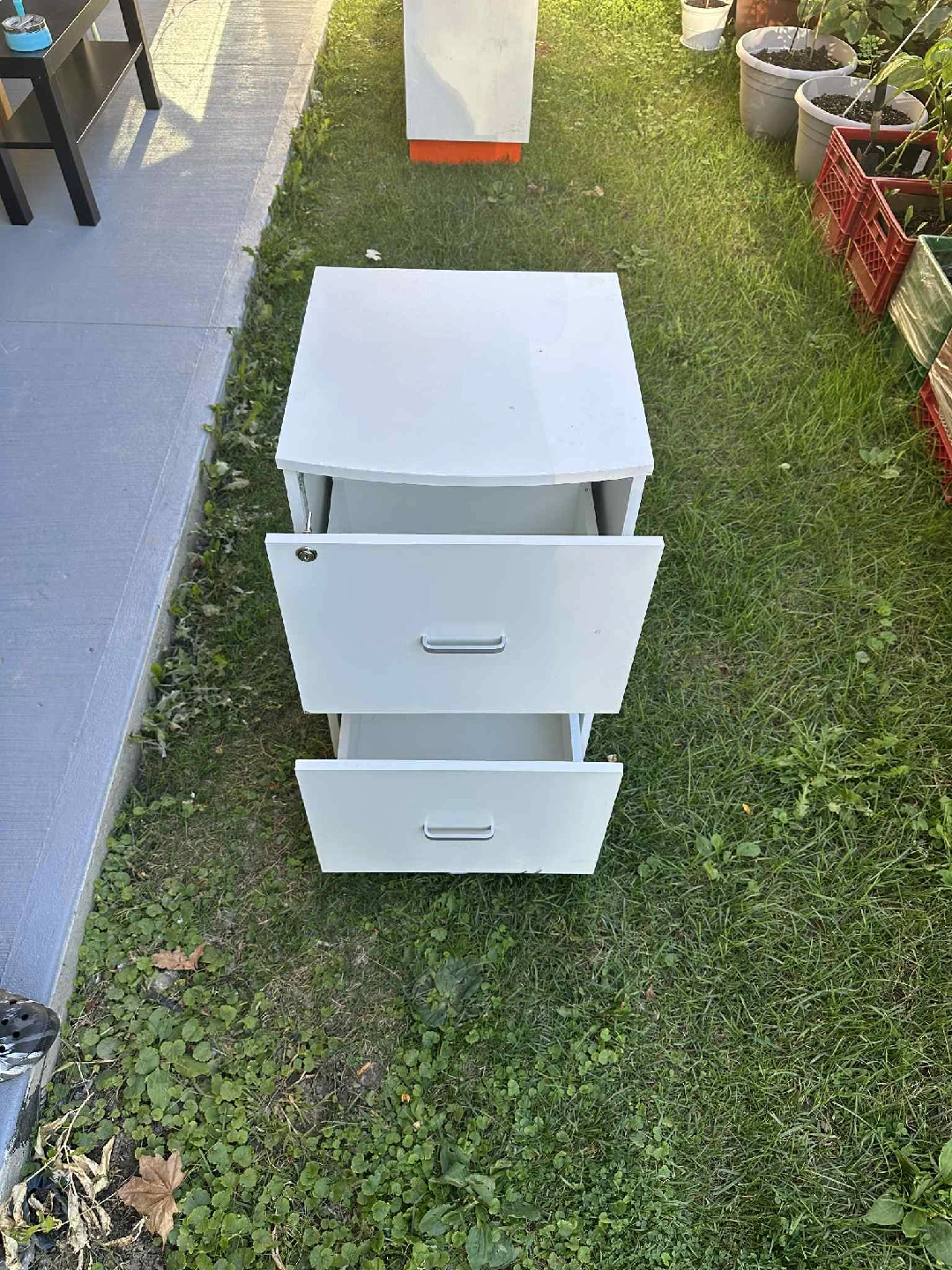 Selling a white two-drawer filing cabinet. It's in great shape and perfect for organizing your home office or workspace. The drawers slide smoothly, making it easy to access your files. A simple and functional piece!