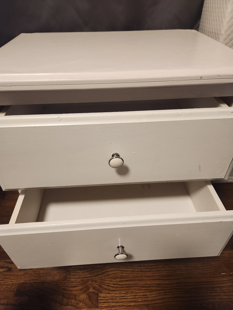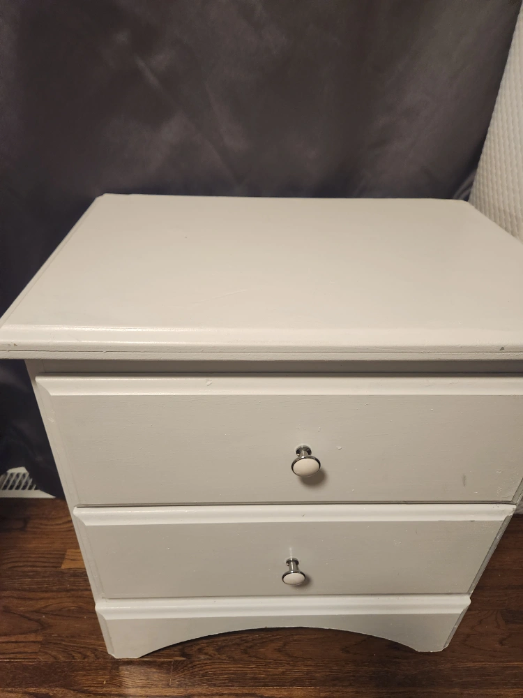 Selling a cute white nightstand with two drawers! It's perfect for a bedside table or as a small storage unit in any room. The drawers slide smoothly, and it's in good condition.