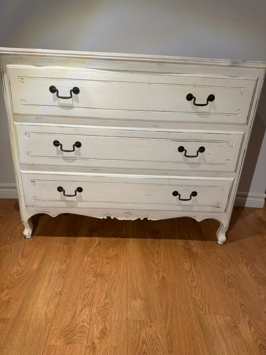 Here's a charming antique-style dresser with 3 drawers! It's perfect for adding a touch of vintage elegance to any room. The dresser is white and features classic drawer pulls. Measurements 42.5x 17.3/4x 33.5