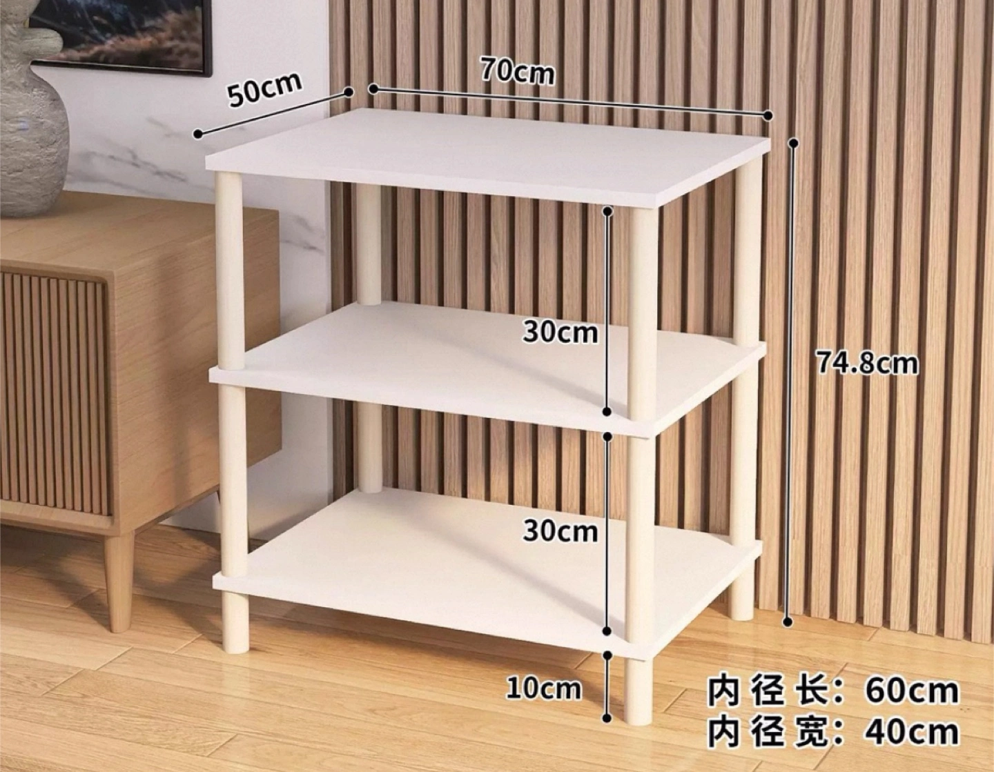 94Here's a handy white 3-tier shelf unit! It's perfect for adding some extra storage to any room. The dimensions are: - 70cm wide - 50cm deep - 74.8cm tall -1.6cm thick The shelves are spaced 30cm apart, and the legs add 10cm of height Has wheels!