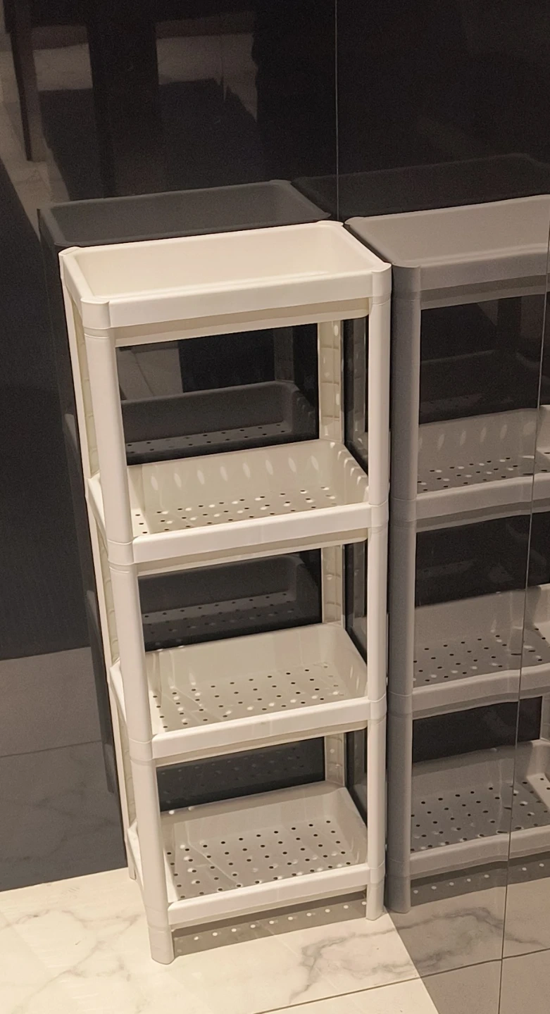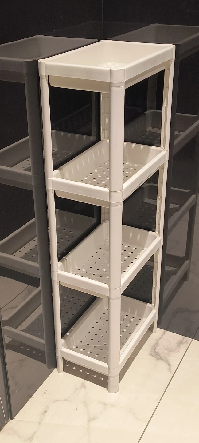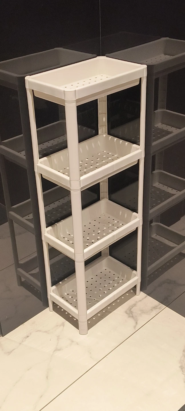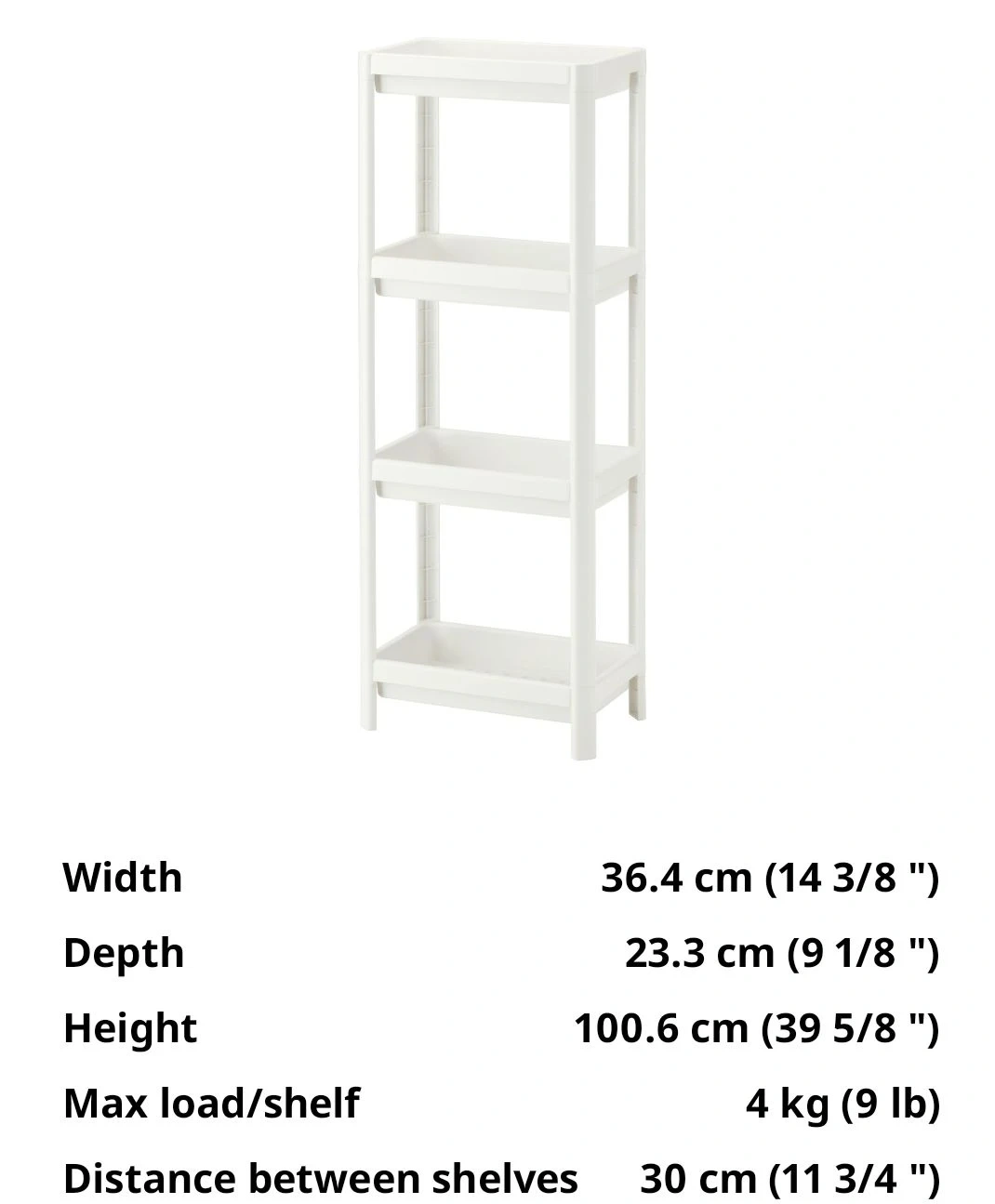 28Here's a handy white plastic shelf unit with four tiers! It's perfect for adding some extra storage space in a bathroom, closet, or anywhere you need it. Dimensions: - Width: 36.4 cm (14 3/8 ") - Depth: 23.3 cm (9 1/8 ") - Height: 100.6 cm (39 5/8 ") - Max load/shelf: 4 kg (9 lb) - Distance between shelves: 30 cm (11 3/4 ") Pick Up Only!! Smoke Free Home. $15 Cash. No E-transfer Pick up area: Dufferin / Dupont