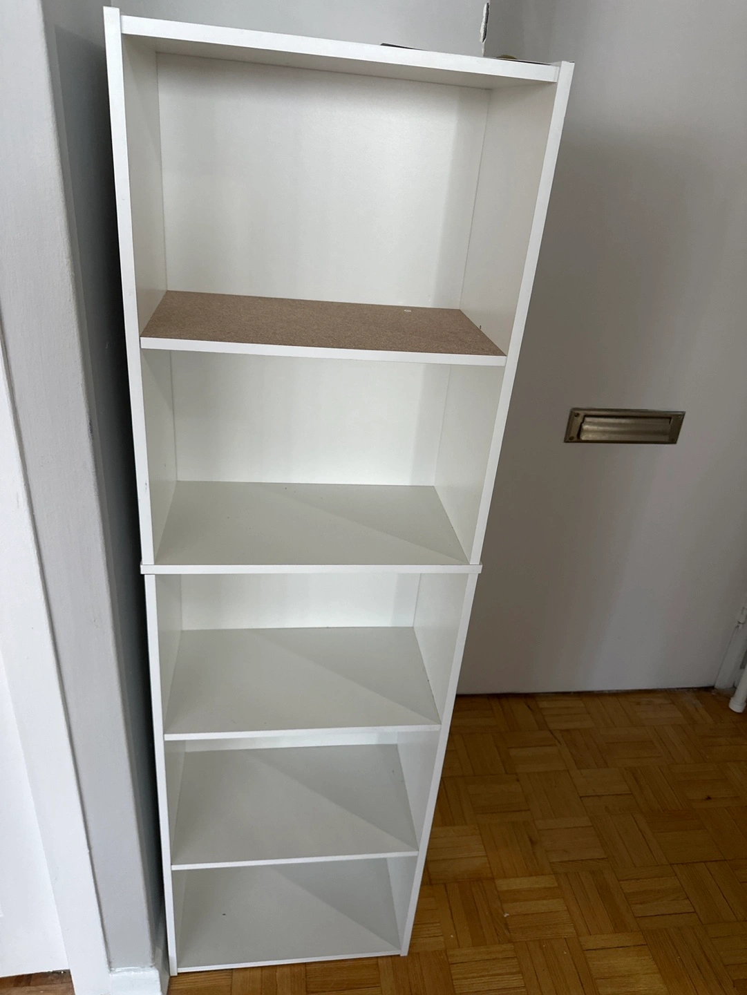 51Tall white bookcase. Five shelves. Good for storage. Assembled. You might need to reassemble the first section since I did it the wrong way.