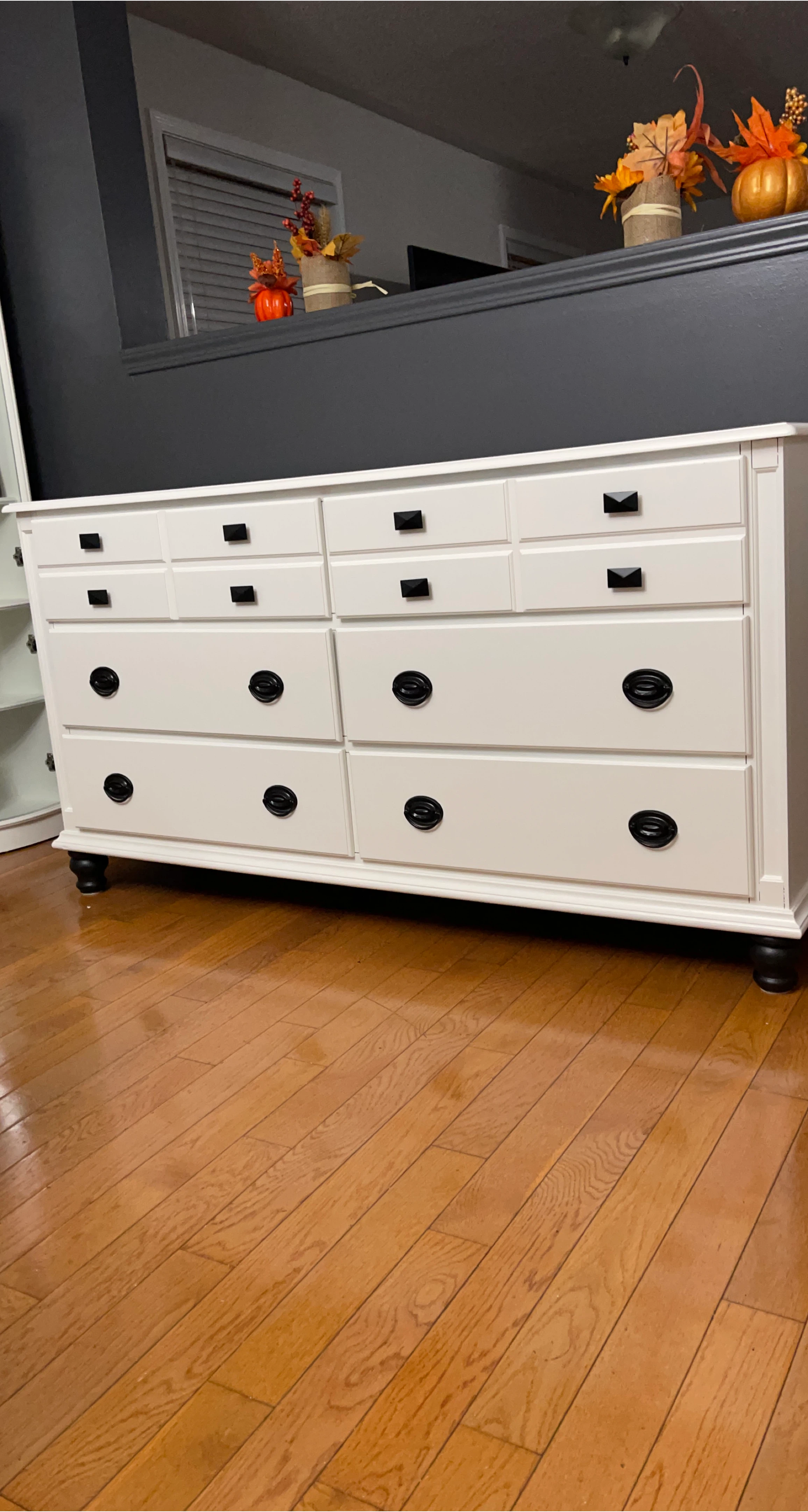 18Selling a white dresser with six drawers. It's in great shape and would be a lovely addition to any bedroom or living space! The dresser has a classic design with round knobs on the bottom drawers and rectangular knobs on the top drawers.