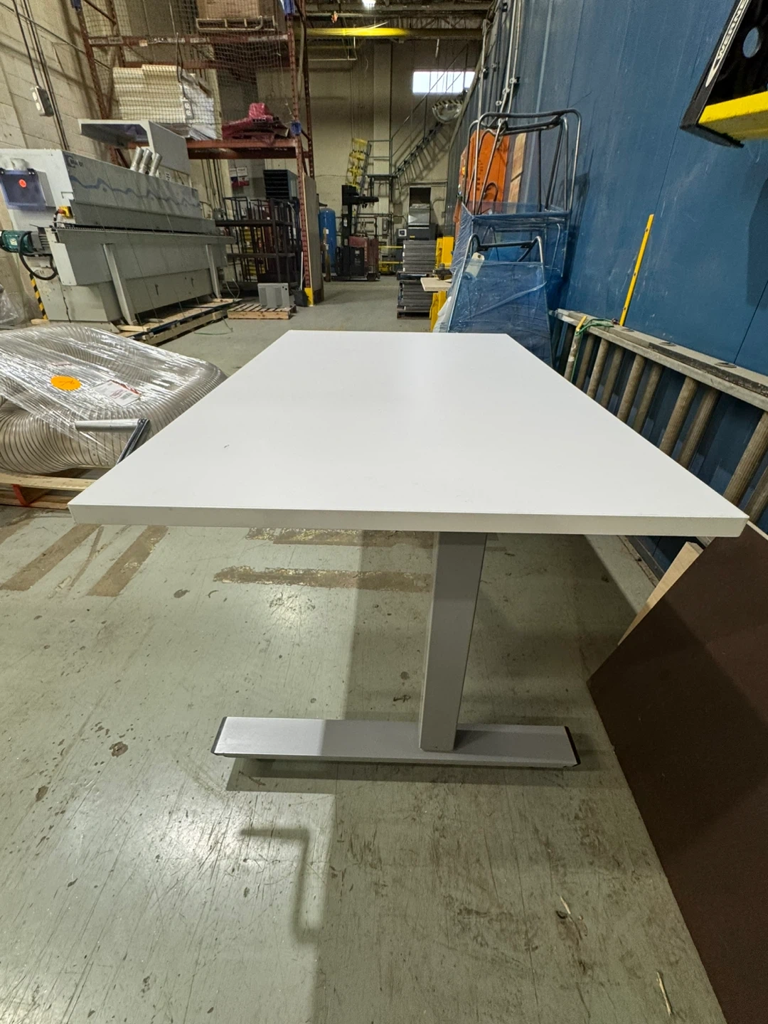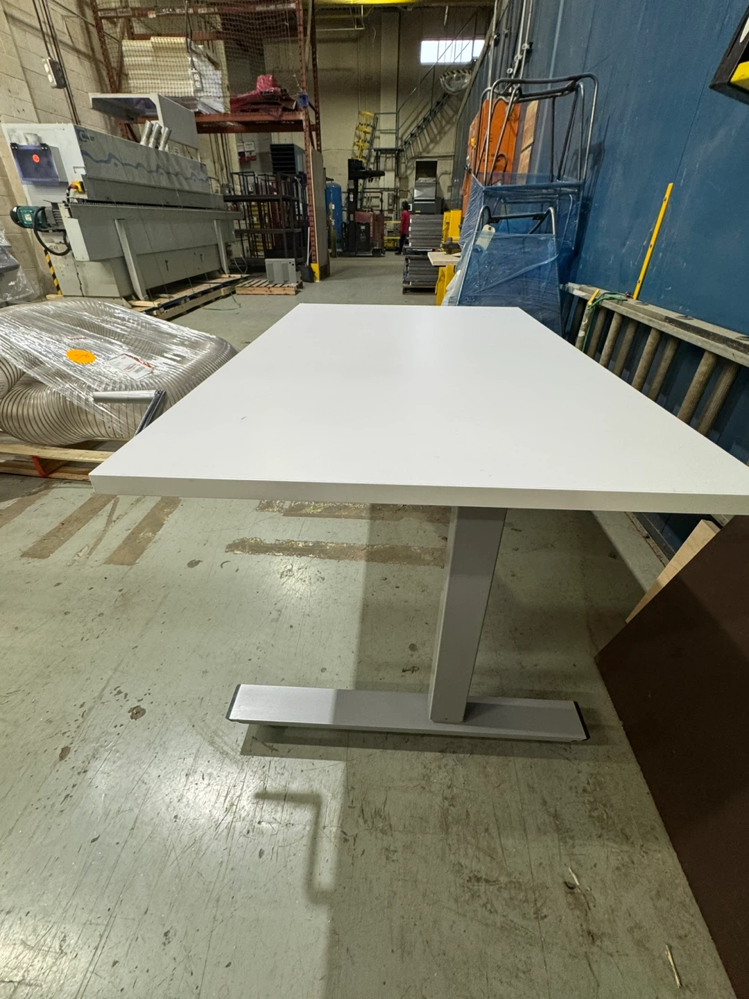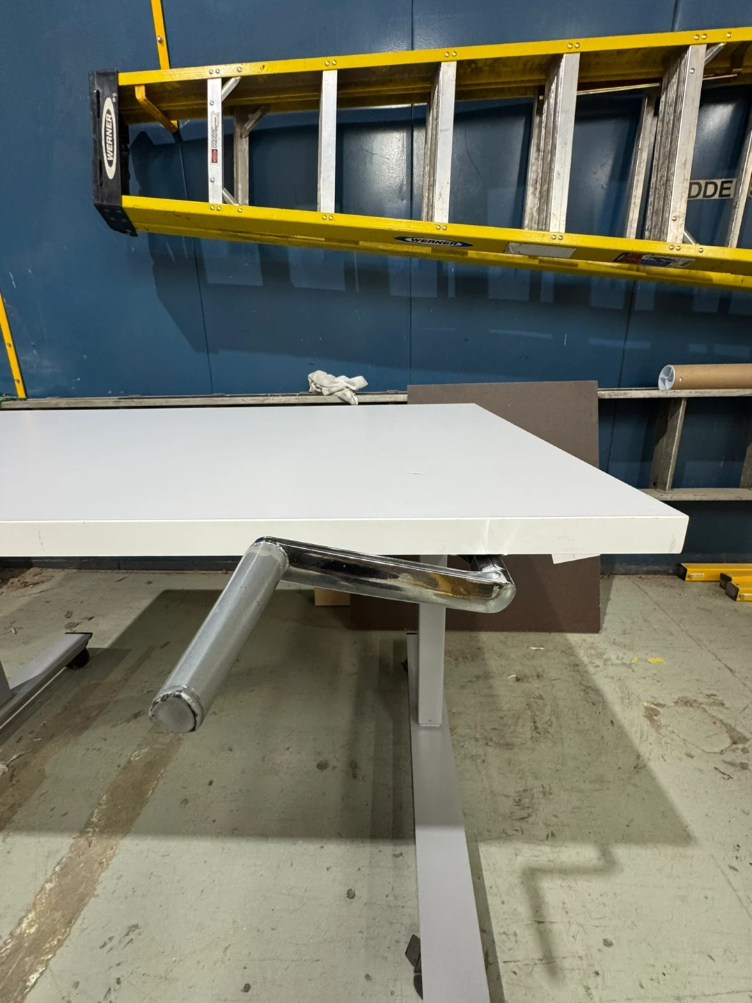 68I'm selling a white adjustable height standing desk. It's in great condition and ready for a new home. Perfect for a home office or workspace! Manual adjustable table, colour white. Works well, no issues. With casters Handle works good. Measurements: Large = 4f 48” Wide = 2.5 f or 30” Hight max = 3.5f or 43.5 “ Lower set max = 2.3f or 28” Base legs = 2.3f or 29.5” YES IT IS AVAILABLE!